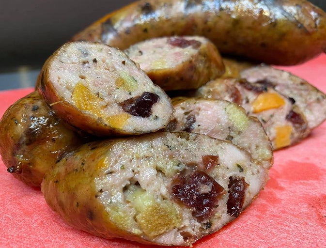 Turkey, confit garlic and celery, brown butter, cornbread stuffing, cranberries and sweet potatoes. Your entire Thanksgiving plate stuffed into a sausage and smoked the perfection. Daddy likey.