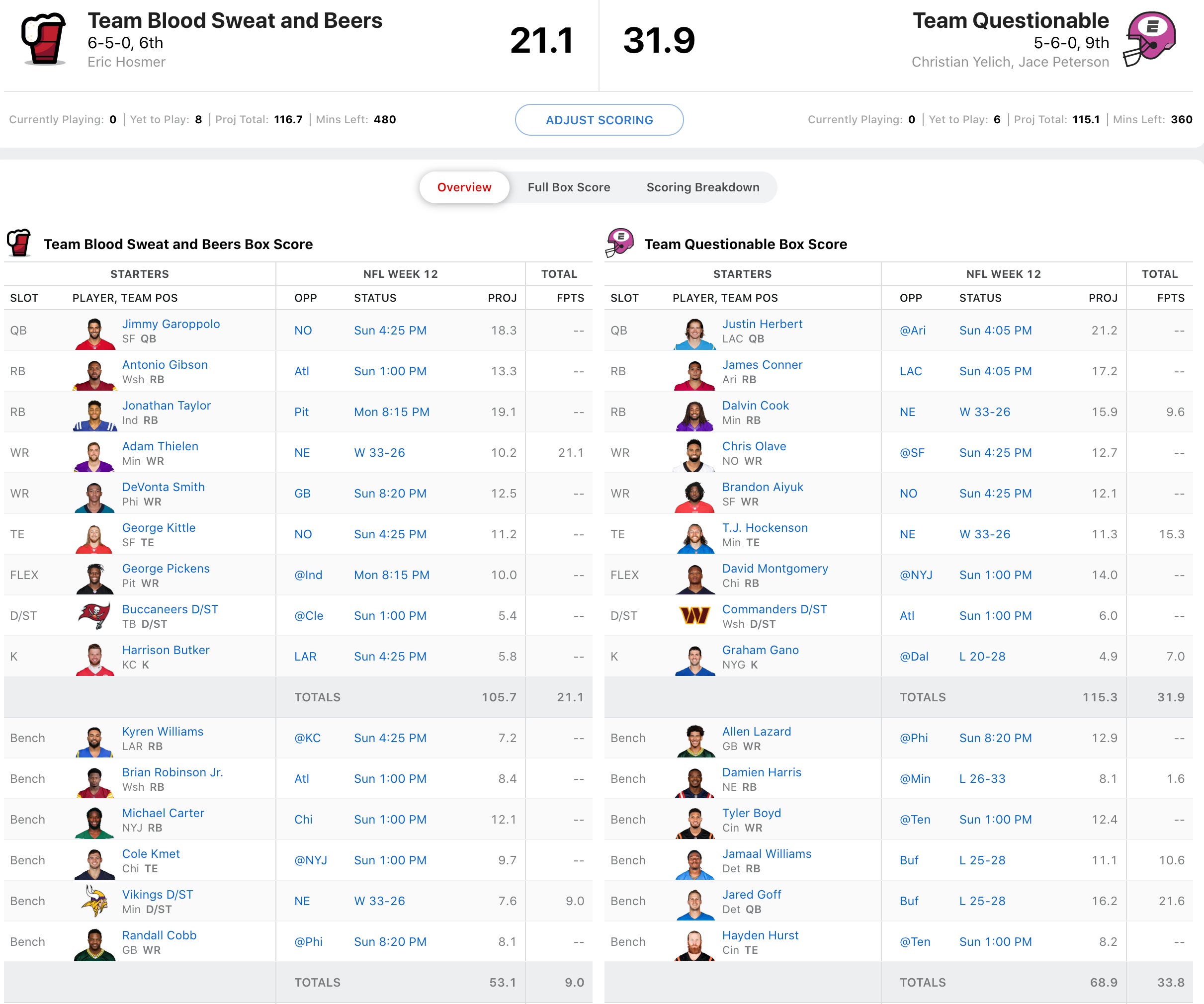 Yelich and Peterson had three guys play alreayd and they basically matched their projection almost to a T. Meanwhile, Hosmer only had one and his guy move than doubled his projection. So good fortune already. This matchup could hinge on David Montgomery who will need a huge game vs. the Jets with Justin Fields out. They'd also like both Justin Herbert and James Conner to return to their 2021 form as they've been disappointing from a fantasy perspective this year. Brandon Aiyuk another one to watch and he's been red hot with 5 TDs in his last 5 games. Meanwhile, the man that could be throwing Aiyuk that TD is on Hosmer's squad where he pairs him with George Kittle, who saved his season on Monday Night. Antonio Gibson gets a leaky Falcons run D and Jonathan Taylor will hve to wait til Monday to show he's getting close to back to last year's peak. This will be a tight one, but I lean Hoz.
