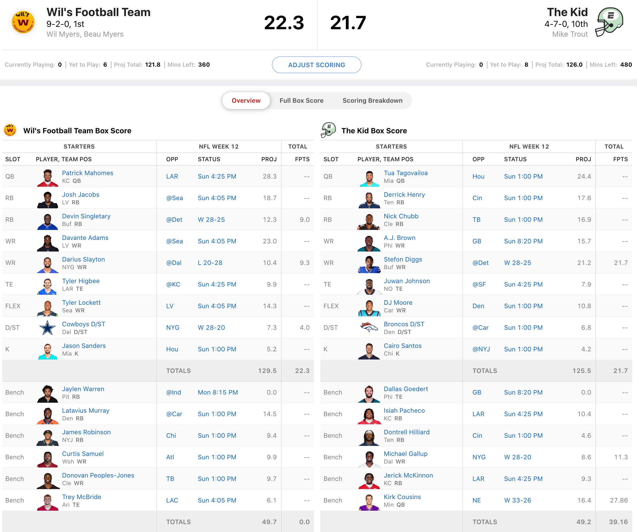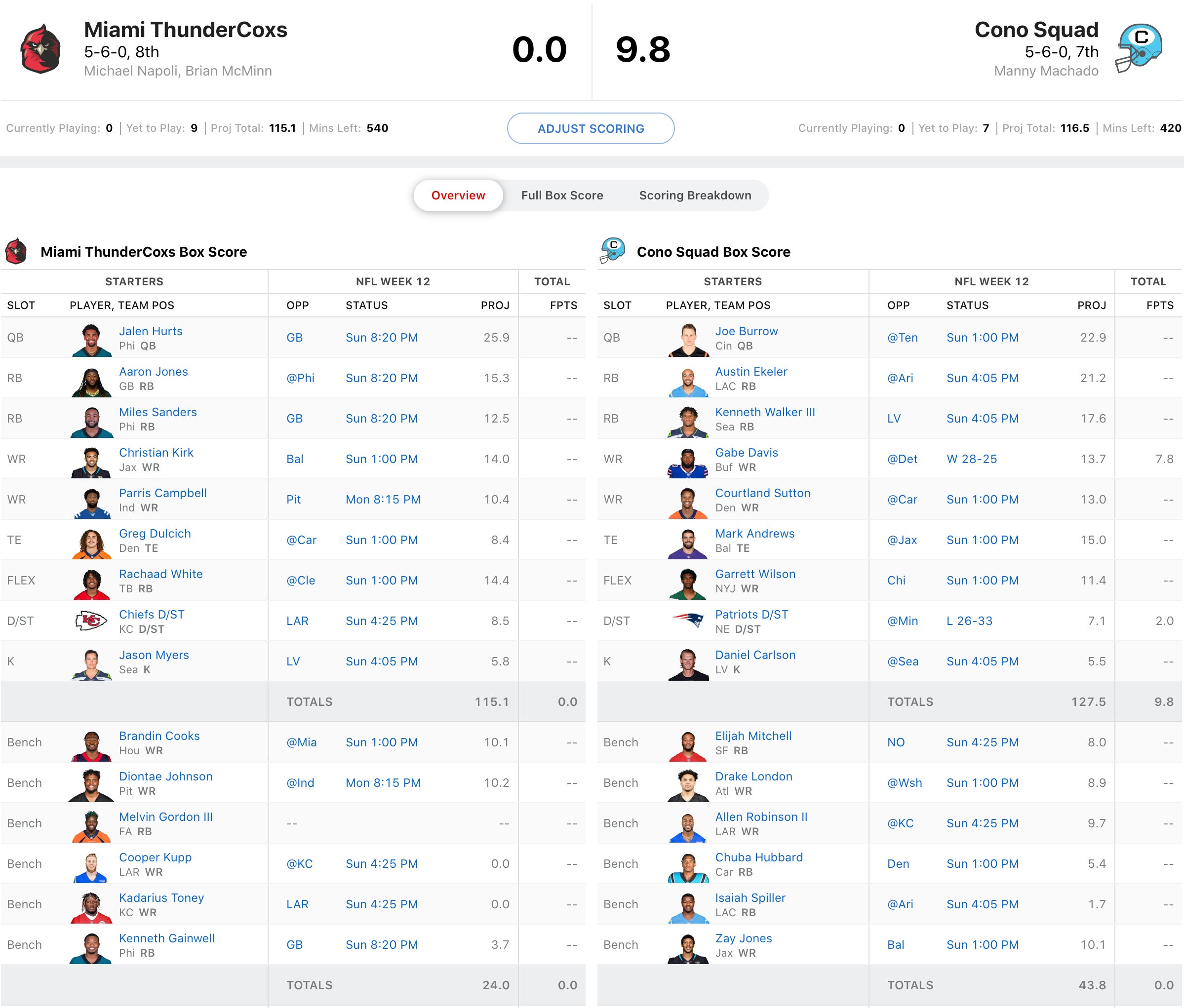 Manny already got two disappointing performances settled on Thursday and that is always a bad omen. He'll need huge games from Kenneth Walker III, Austin Ekeler, Mark Andrews and Joe Burrow. Meanwhile, future Hall of Famer, Mike Napoli has been ravaged by injury at the WR position with Cooper Kupp on IR and Kadarius Toney missing the game today. He does have underperforming vets Brandin Cooks and Diontae Johnson on the bench, but with their performances this year, I can't fault him for that. It'll all be on Jalen Hurts/Miles Sanders duo to put him over the top.