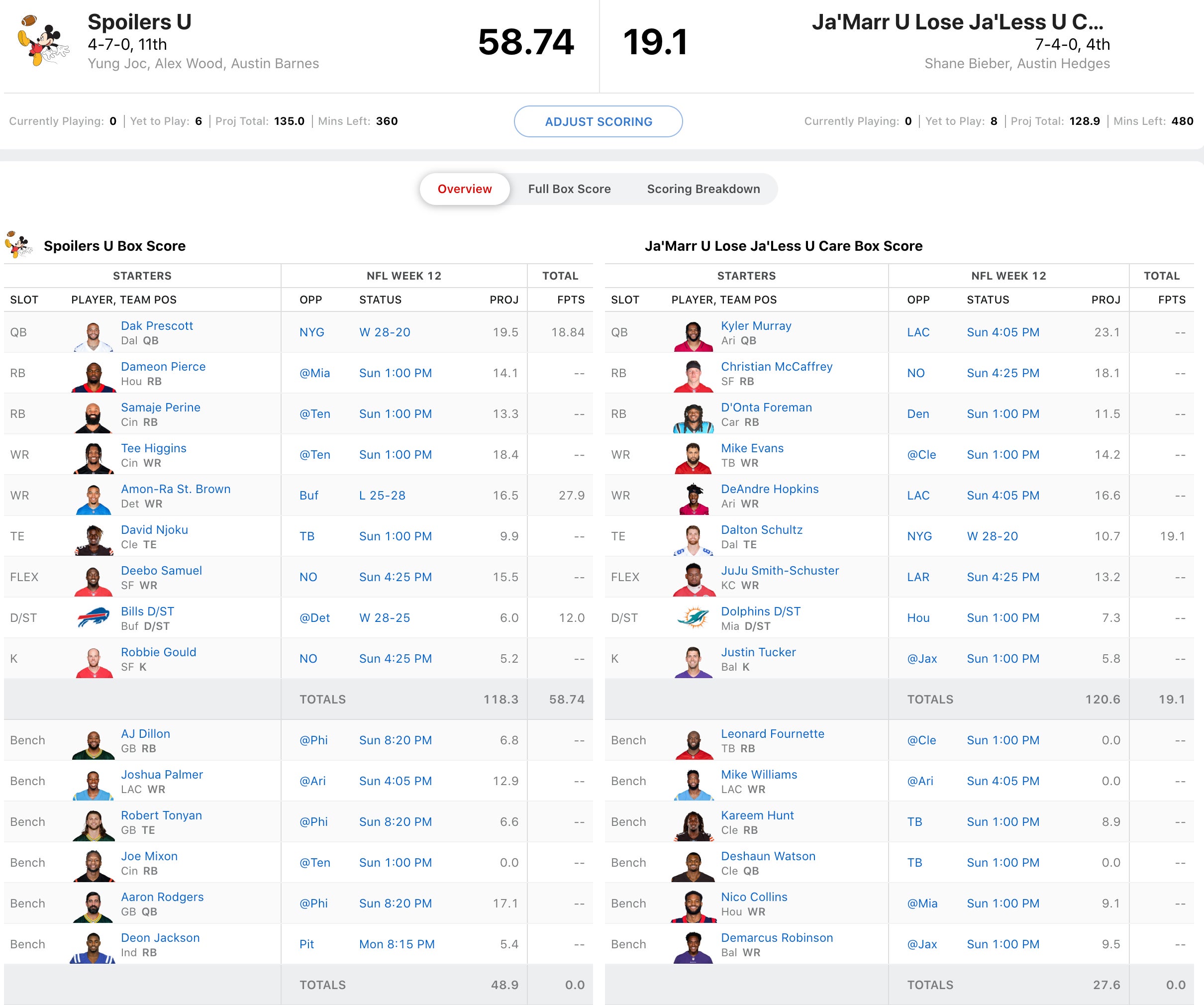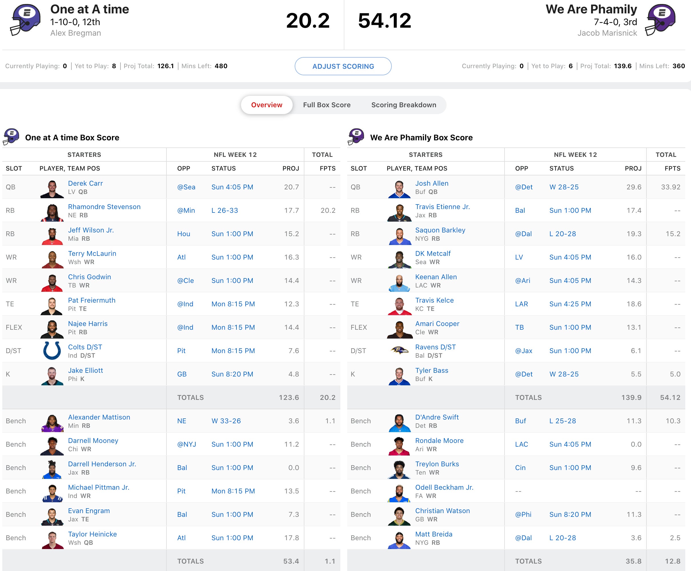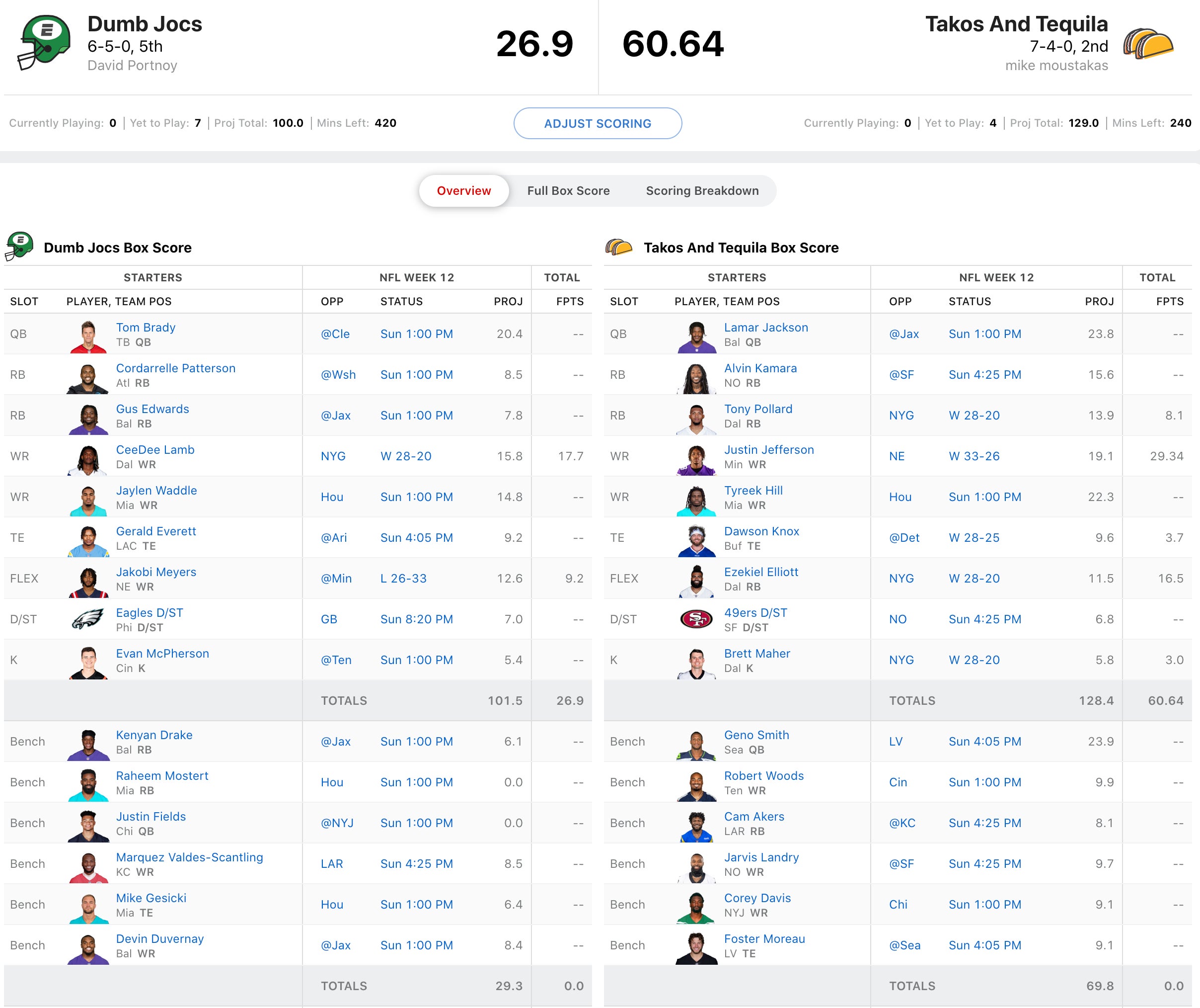 A win here would virtually lock Dave into a playoff spot with two weeks left in the regular season, but he's obviously short handed with Fields and Raheem Mostert both out. He'll be forced to start his old pal, Tom Brady who is in a potentially rainy game against the Browns. He'll need big games from Cordarrelle Patterson and Jaylen Waddle in addition to Brady to survive this onslaught from Moose which was headlined by Justin Jefferson shredding Dave's Pats on Thanksgiving. If he can get solid games out of Lamar Jackson, Alvin Kamara, and Tyreek Hill he should win easily.