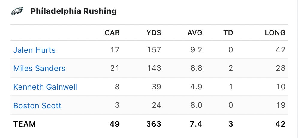 You see that kinda stat line in college when an elite SEC team goes up against the Citadel. You got it in a Sunday Night Football game! Joe Barry should have been left in London after the Giants game. It's malpractice to continue letting that man run this defense. That was just about the least prepared defense I've ever seen. I mean it's like Barry had no clue Jalen Hurts was capable of running the football. Nothing like giving up the 5th most rushing yards to a QB in a single game ever. Hell yeah! Pray that Jim Leonard actually wants to become the defensive coordinator when the job opens up this time.