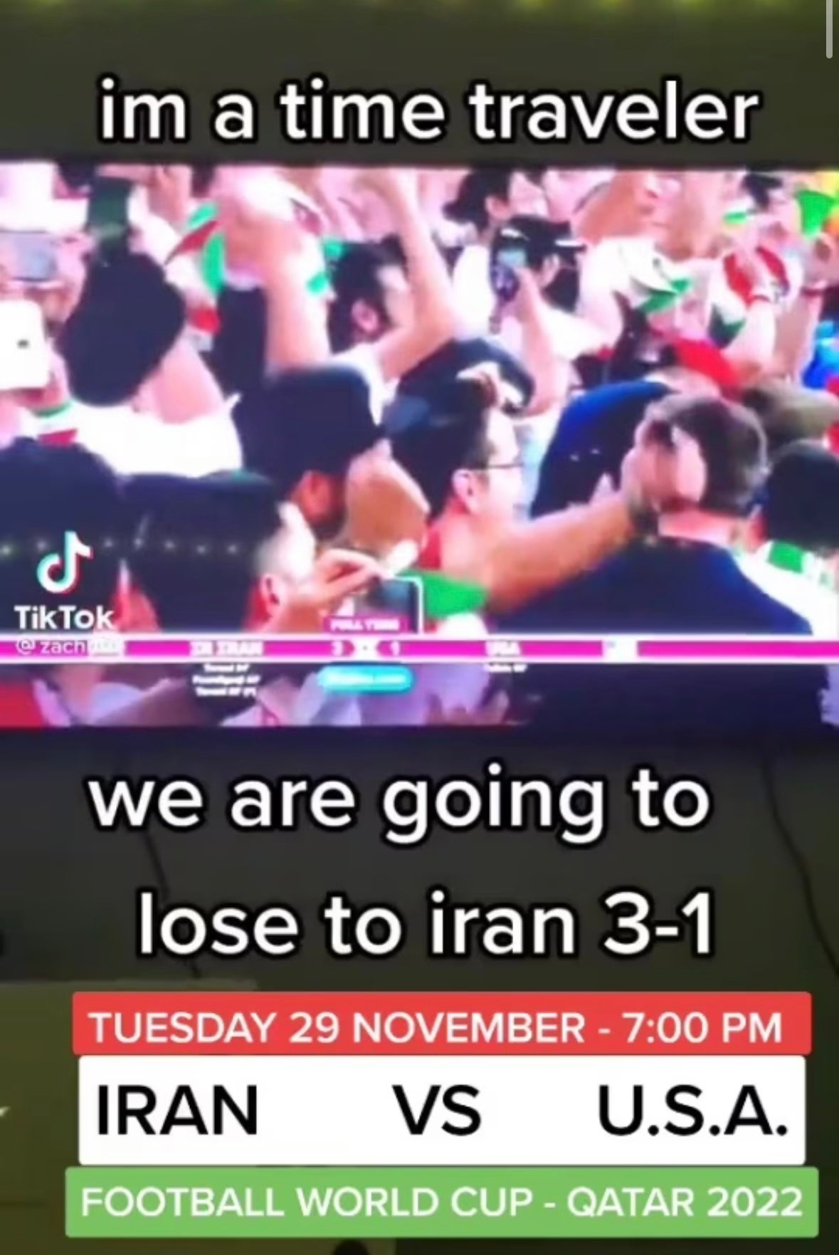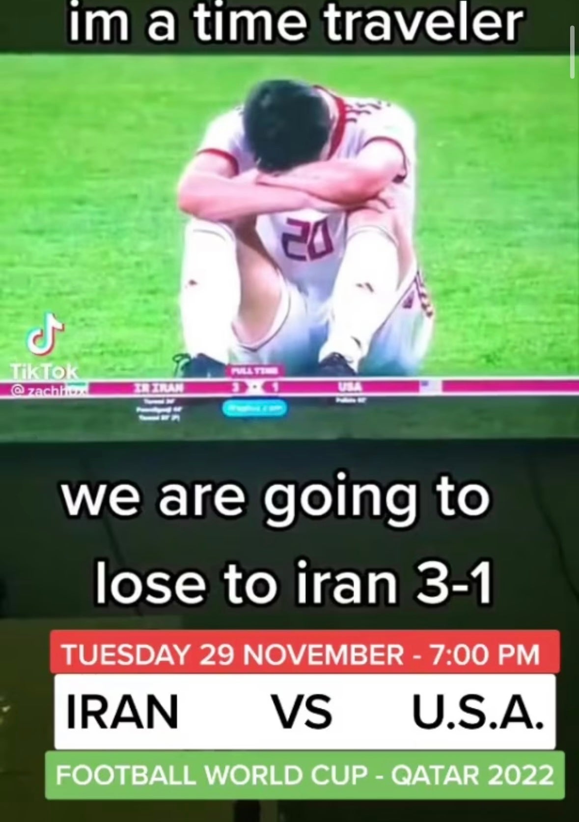 Sure the images shown are from Irans last World Cup in 2018 sporting the same uniforms they wore then and aren’t wearing this year. And sure the images of Pulisic shaking hands is from after the England match, but what do you want from the guy? He gave the score, he even gave the minutes and scorer of each goal- Mehdi Taremi and Morteza Pouraliganji for Iran and Pulisic for USA.