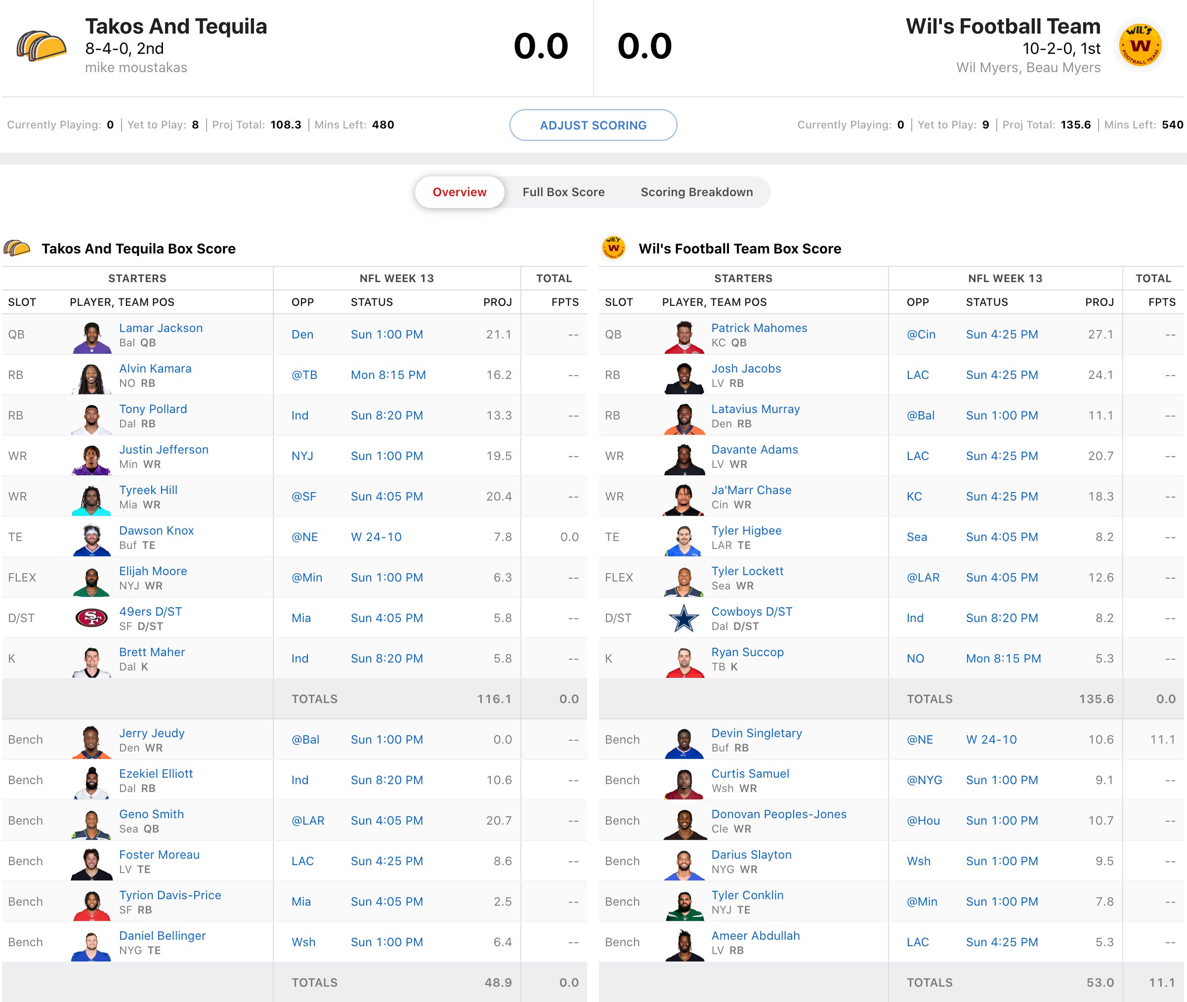 Moose got off to a rough start with Dawson Knox putting up every fantasy manager's worst nightmare, a Thursday night donut. He's got some absolute stallions on his team with Tyreek Hill, Justin Jefferson, and Lamar Jackson, but they've all got fairly tough matchups this week. I do think Hill has a big game, but Jefferson gets a stingy Jets D that features a superstar CB in Sauce Gardner and Lamar Jackson gets one of the league's best defenses. Meanwhile, Wil Myers has a dream matchup with Patrick Mahomes going against the Bengals in what should be a shootout and Josh Jacobs and Davante Adams in a key divisional game that should be high scoring. And he gets Ja'Marr Chase back vs. the Chiefs. So for all those reasons, I gotta lean with Wil Myers who will clinch the #1 seed with a win.