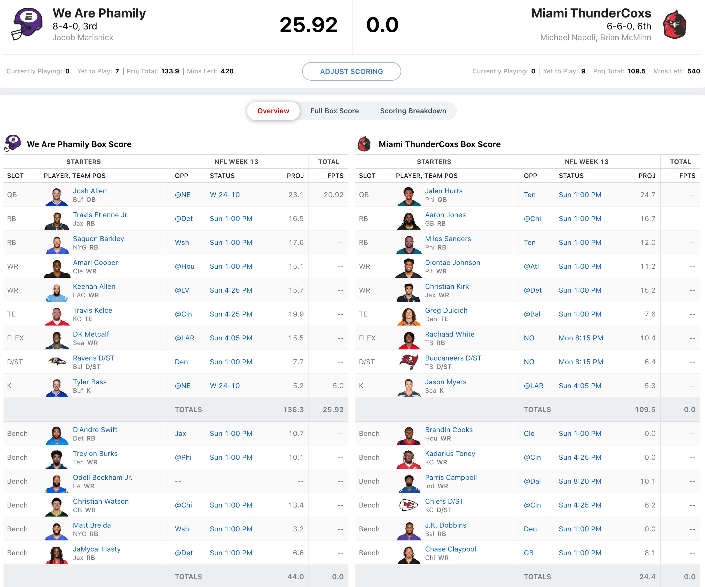 Napoli has had a nice couple weeks now and he'll need his Eagles duo of Jalen Hurts and Miles Sanders to come up very big to have a shot in this one. Aaron Jones against the Bears has a chance to really pop, but Rachaad White is welcoming back Leonard Fournette this week against a team that plays the Bucs really tough, so his upside may be capped. Meanwhile, for Marisnick, Josh Allen had a serviceable game and he welcomes back Travis Etienne who is playing today. He also gets a boost with Deshaun Watson throwing the ball to Amari Cooper and Travis Kelce is in a potential shootout. This roster is so stacked, I like it to move into the bye range with a win.