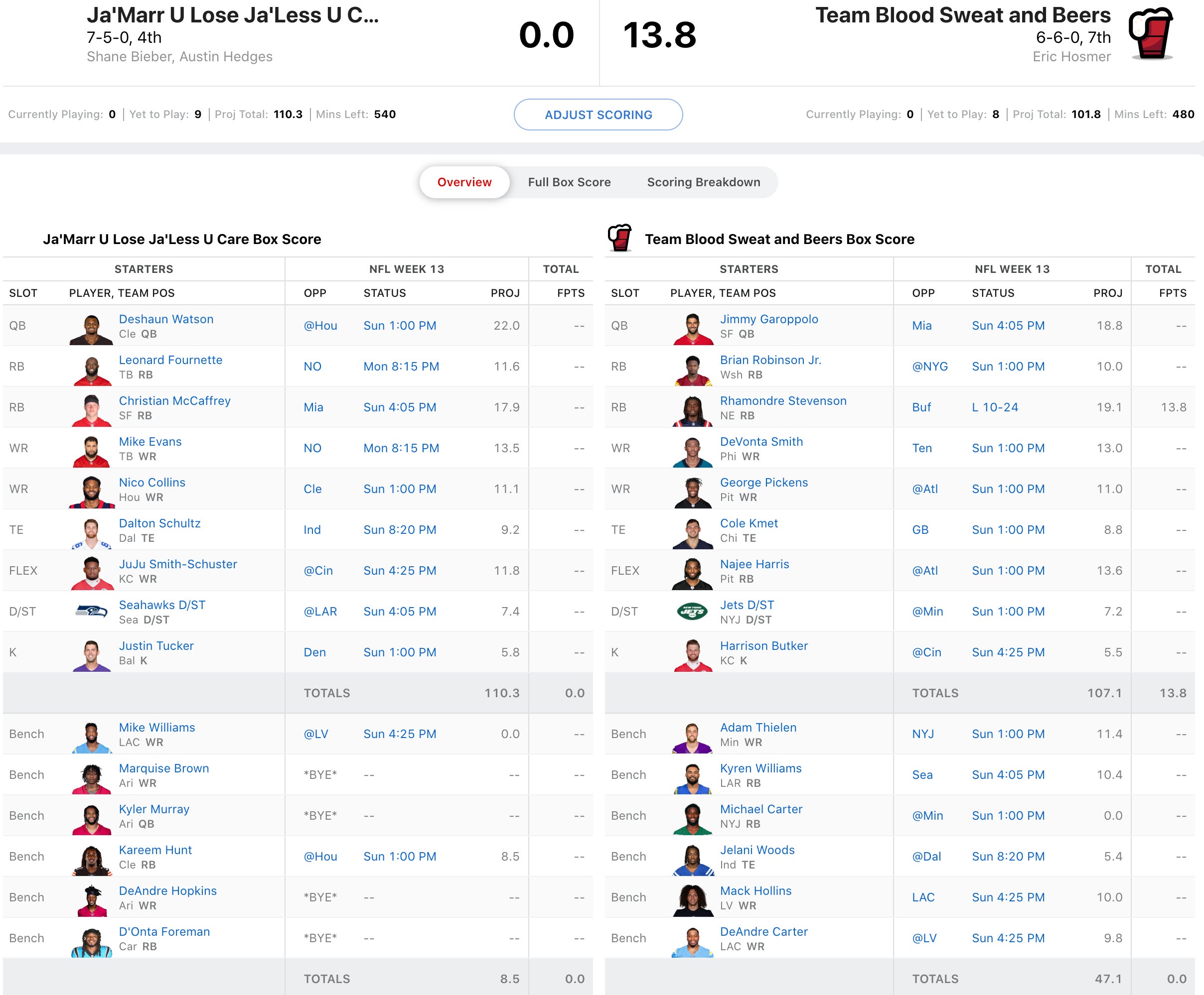 This is a very interesting matchup because Bieber and Hedges are relying on their fellow Clevelander, Deshaun Watson to help put them into the playoffs, which they'll clinch with a win. With Elijah Mitchell going down in San Francisco, expect Christian McCaffrey to take on a bigger workload. JuJu Smith-Schuster has a tasty matchup and they made a savvy move picking up the Seahawks D/ST that will get a depleted Rams squad today. Meanwhile, the mid-week trade just before the deadline to land Rhamondre Stevenson and Najee Harris hasn't exactly worked out yet with Stevenson falling 5.3 points short of his projection. Jimmy G will need to have a big game and that's not what you want to hear going into a fantasy Sunday. I'll take Bieber & Hedges today.
