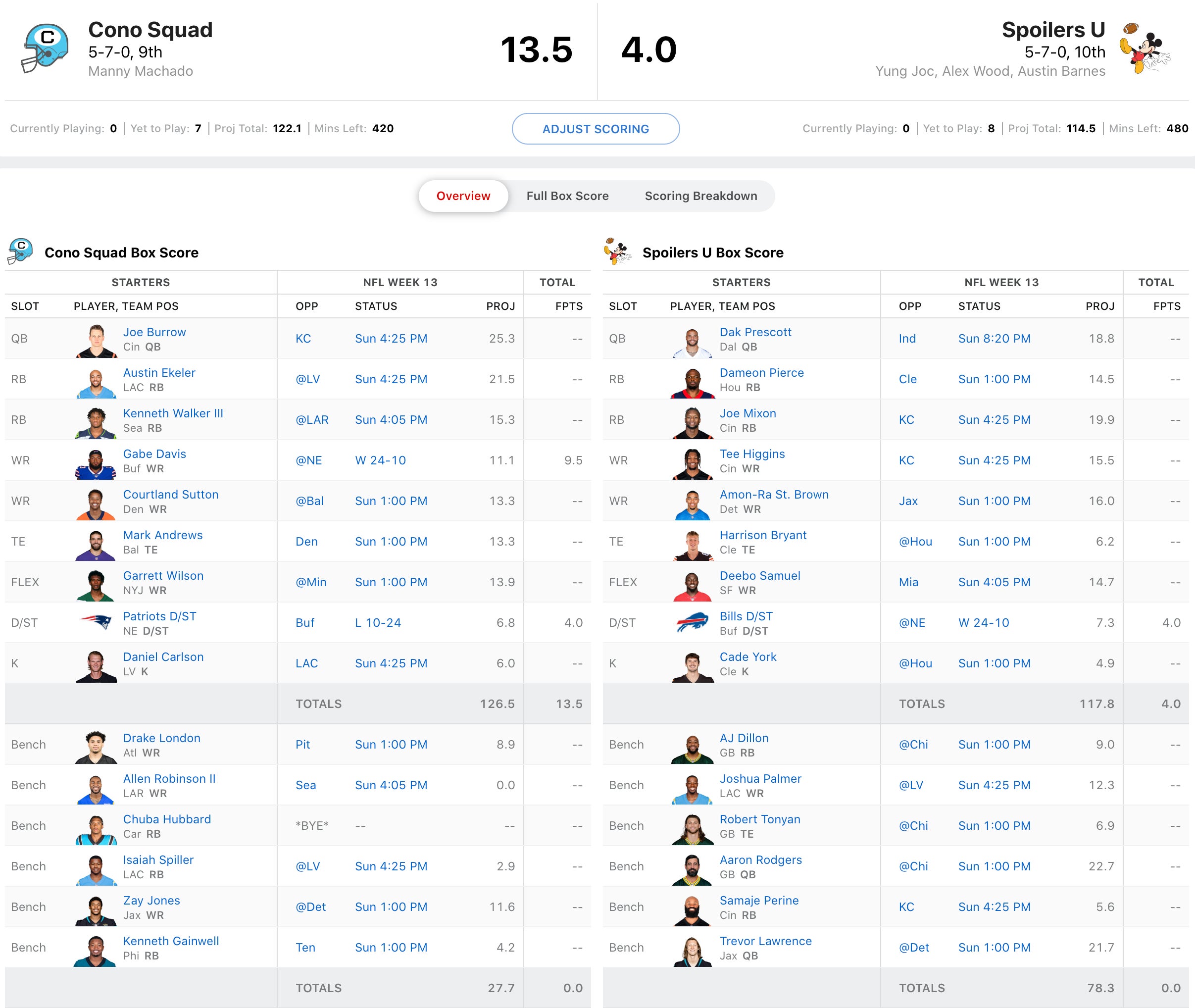 Joe Burrow is a top QB option this week, especially in a 6-point passing TD league going against the Chiefs in a game with a projected 53 point total. Kennether Walker has struggled, but looks to bounce back against a struggling Rams team. But Austin Ekeler has been a monster in PPR this year and should have a big game against a bad Raiders D. But Spoilers U has been hot and I like Dameon Pierce today in a big game for the Texans against their old QB. Deebo Samuel is beat up but will play, but I think this game comes down to Joe Mixon. If he plays, I like Spoilers U. If he doesn't, he's got Samaje Perine, but he doesn't present nearly the upside that Mixon, who has the league high points scored for a week with 55 in his 5 TD game vs. Carolina. So I'll roll with the upset here.