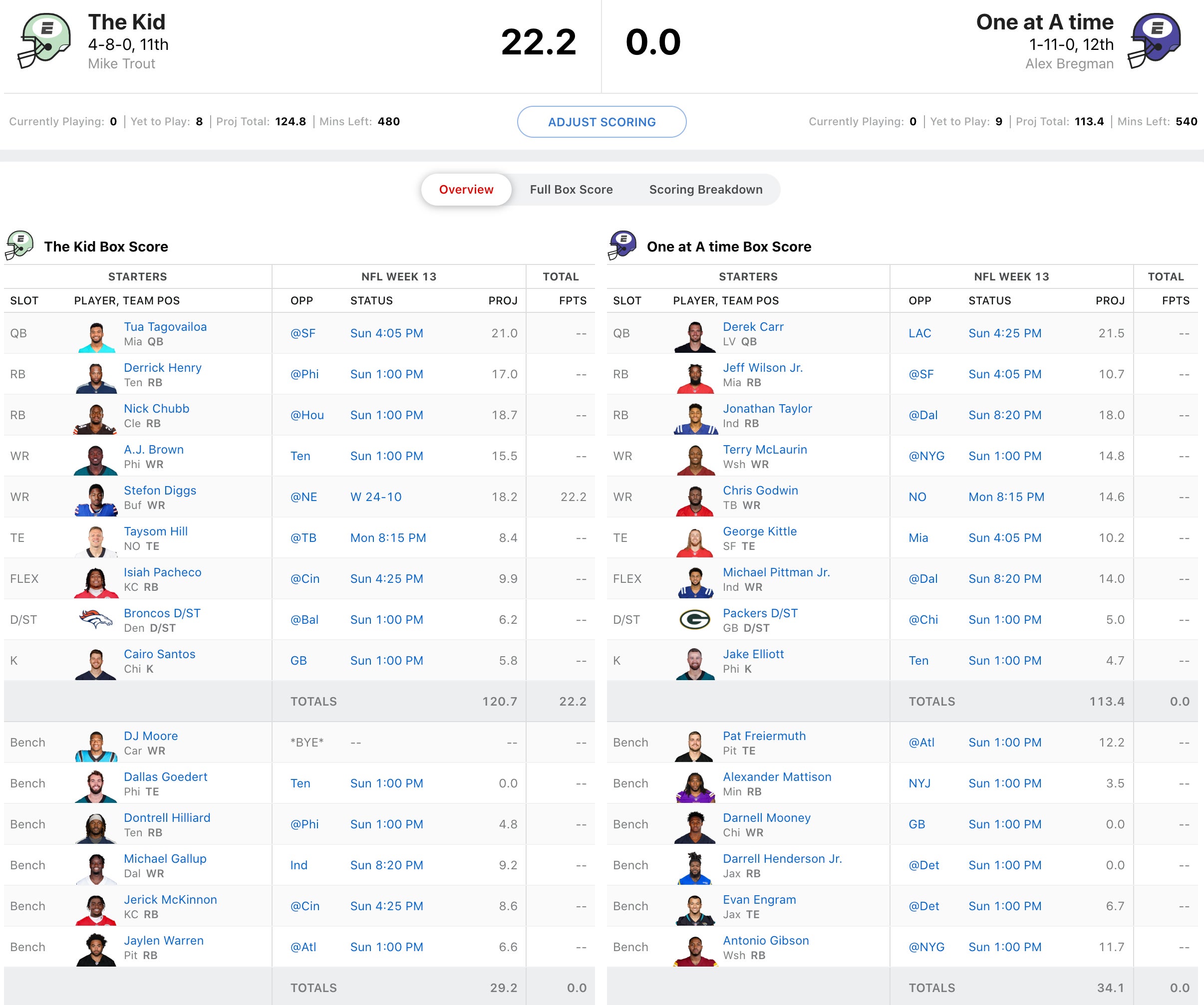Bregman has been frisky the past few weeks despite having just one win on the year. He's got some ascending players in Terry McLaurin, Chris Godwin, George Kittle, and Jeff Wilson Jr. I also like the matchup for Derek Carr today and Jonathan Taylor looks to reesatablish himself with Jeff Saturday at HC. But Trout's team is just a wagon and the backfield of Derrick Henry and Nick Chubb is elite. AJ Brown gets himself a revenge game against his old team and Taysom Hill is a sneaky good play at TE with Juwan Johnson out. He's also been getting QB reps recently. Tua will look to avenge Mike McDaniel against his old team and Isiah Pacheco is the starter in that projected shootout vs. the Bengals, so I'll take Trout today.