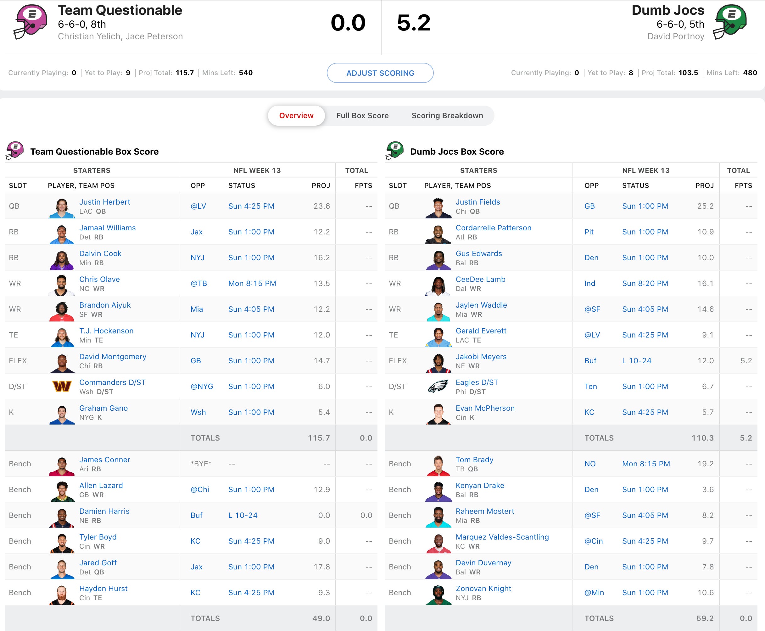 Dave will also need his backfield to have a day. He's starting Cordarrelle Patterson and Gus Edwards. He's in a tough predicament here because he's got Zonovan Knight who should get a majority of the Jets carries on the bench and also leaving Raheem Mostert on the bench in a revenge game. These are the tough calls that decide a season, so let's see if it works out for Dave today. I think this will be a very close matchup as that could be decided by Chris Olave on Monday Night. Yelich & Jace will need big games from Jamaal Williams and TJ Hockenson today, but they both have favorable positional matchups. A lot of this matchup depends on exactly how healthy Justin Fields is. If Justino is cooking, I think it's lights out for Yelich & Jace.