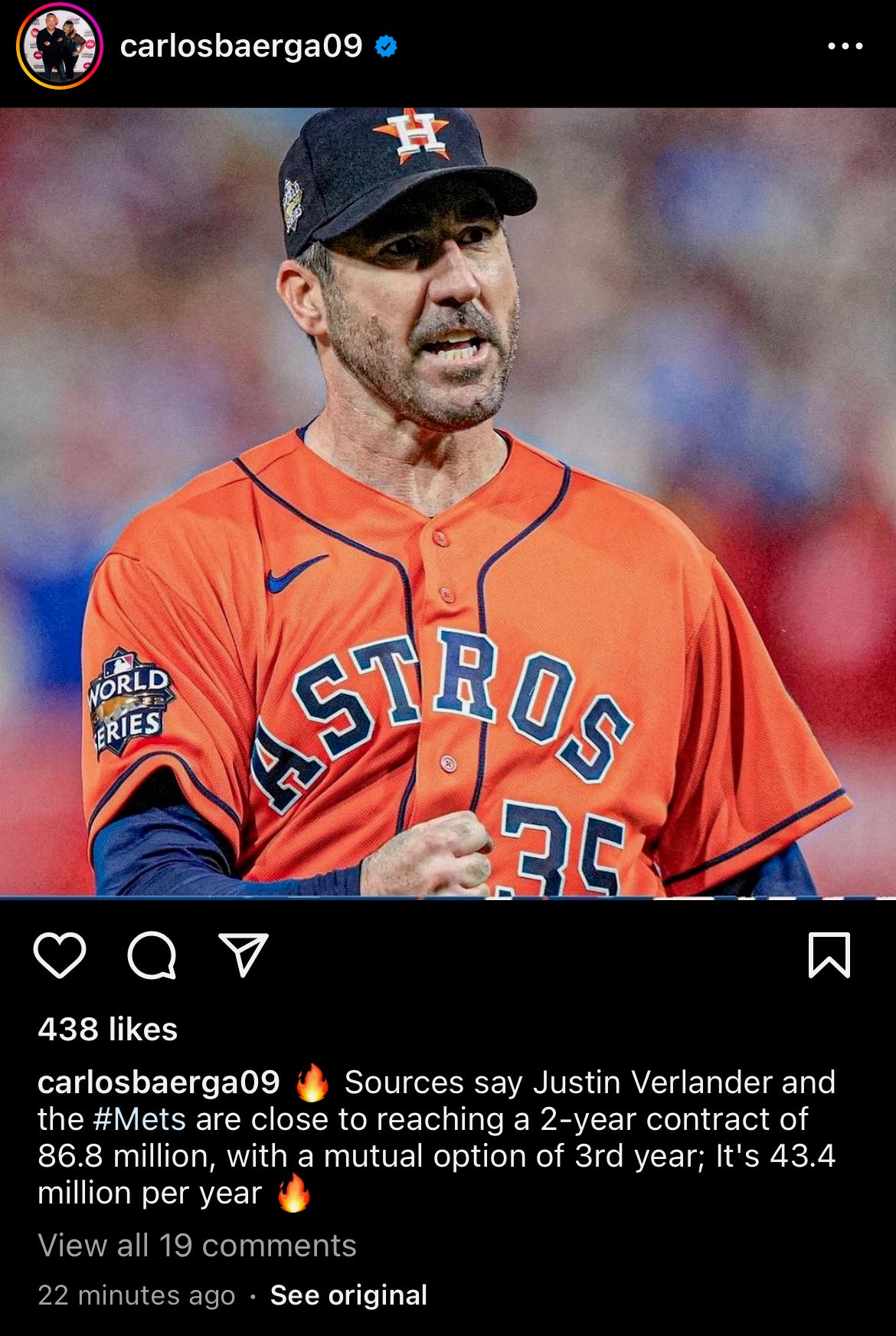 As the days go by, it becomes clearer that Jacob deGrom didn't want to be back in New York, which is fine. It hurt like a motherfucker, but it is what it is. So Uncle Stevie took Jake's reported offer from his couch cushions and gave it Justin Verlander, who gladly accepted and wants to be here.