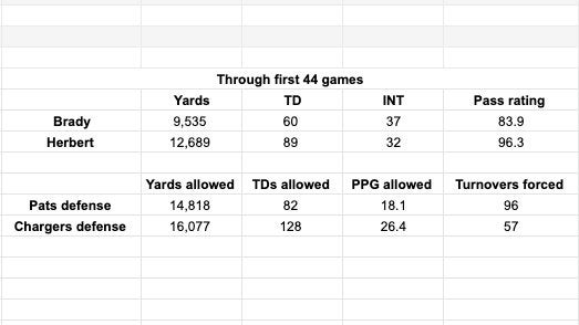 Take a look at Herbert's first 44 games vs Brady's. By every metric, Herbert has played MUCH better. But for some really weird reason, the Chargers are 22-23 over this stretch and the Patriots were 32-14 with 2 Super Bowl wins. Can't possibly figure out why!