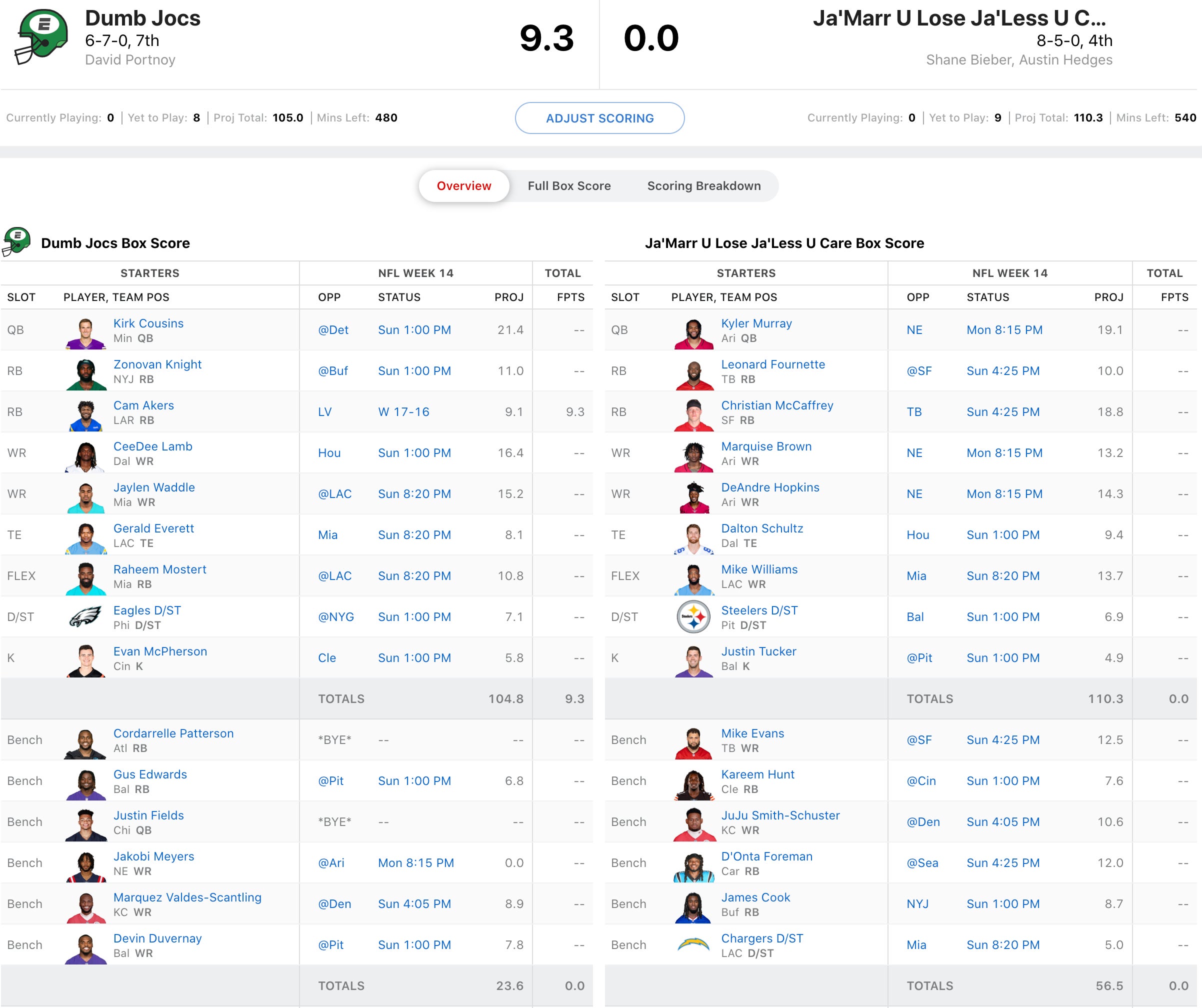 I am huge on the Vikings vs. Lions game so I love Kirk Cousins today. Cam Akers fared well enough, despite his big fumble on Thursday Night. Dave will need big games from Bam Knihgt, CeeDee Lamb, and Jaylen Waddle, but all have decent matchups. The duo fo Shane Bieber/Austin Hedges are starting a wild stack of Kyler Murray, DeAndre Hopkins, AND Hollywood Brown which could work perfectly or blow up in their faces. I think the Patriots do Dave a favor and help him sneak into the playoffs.