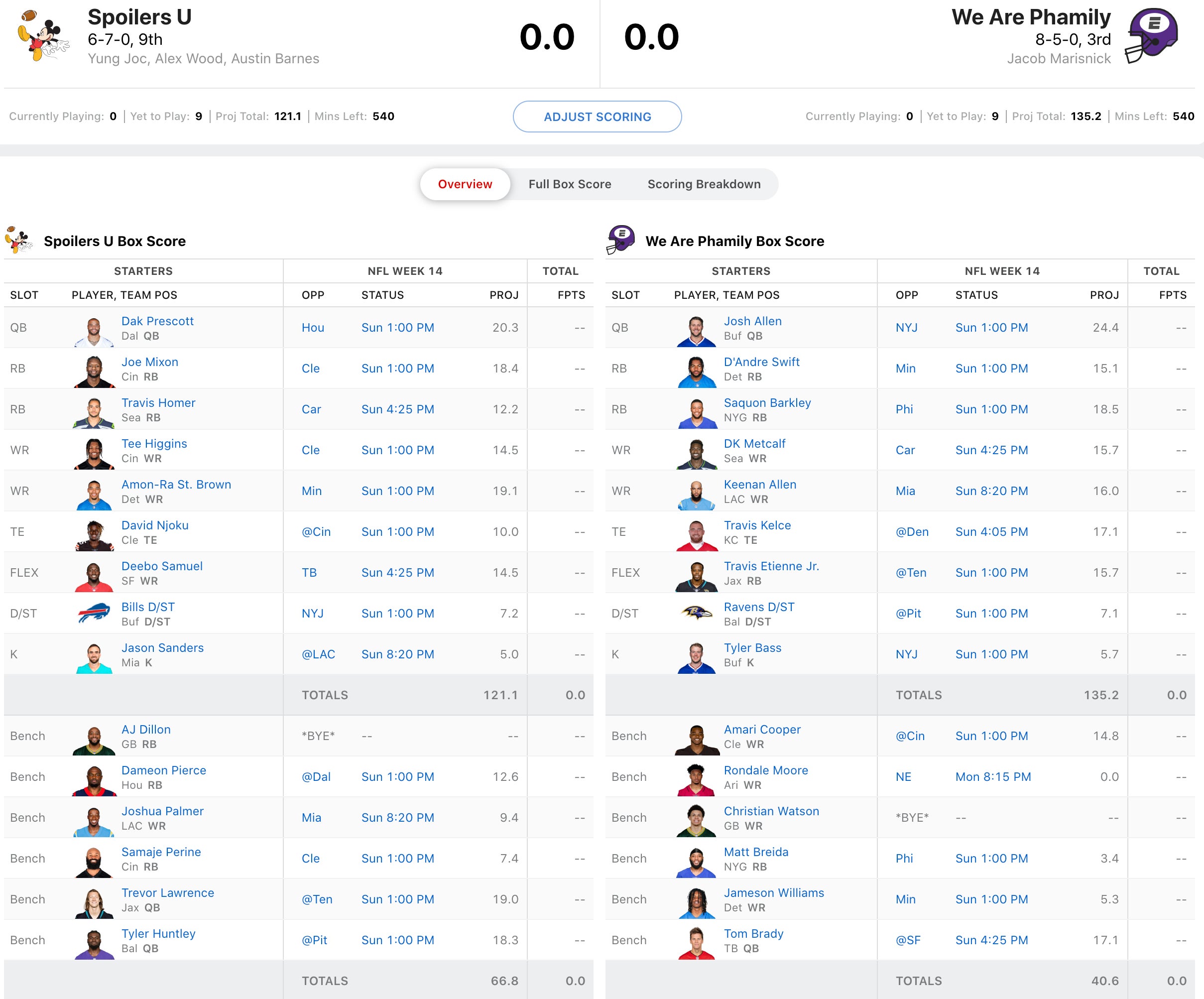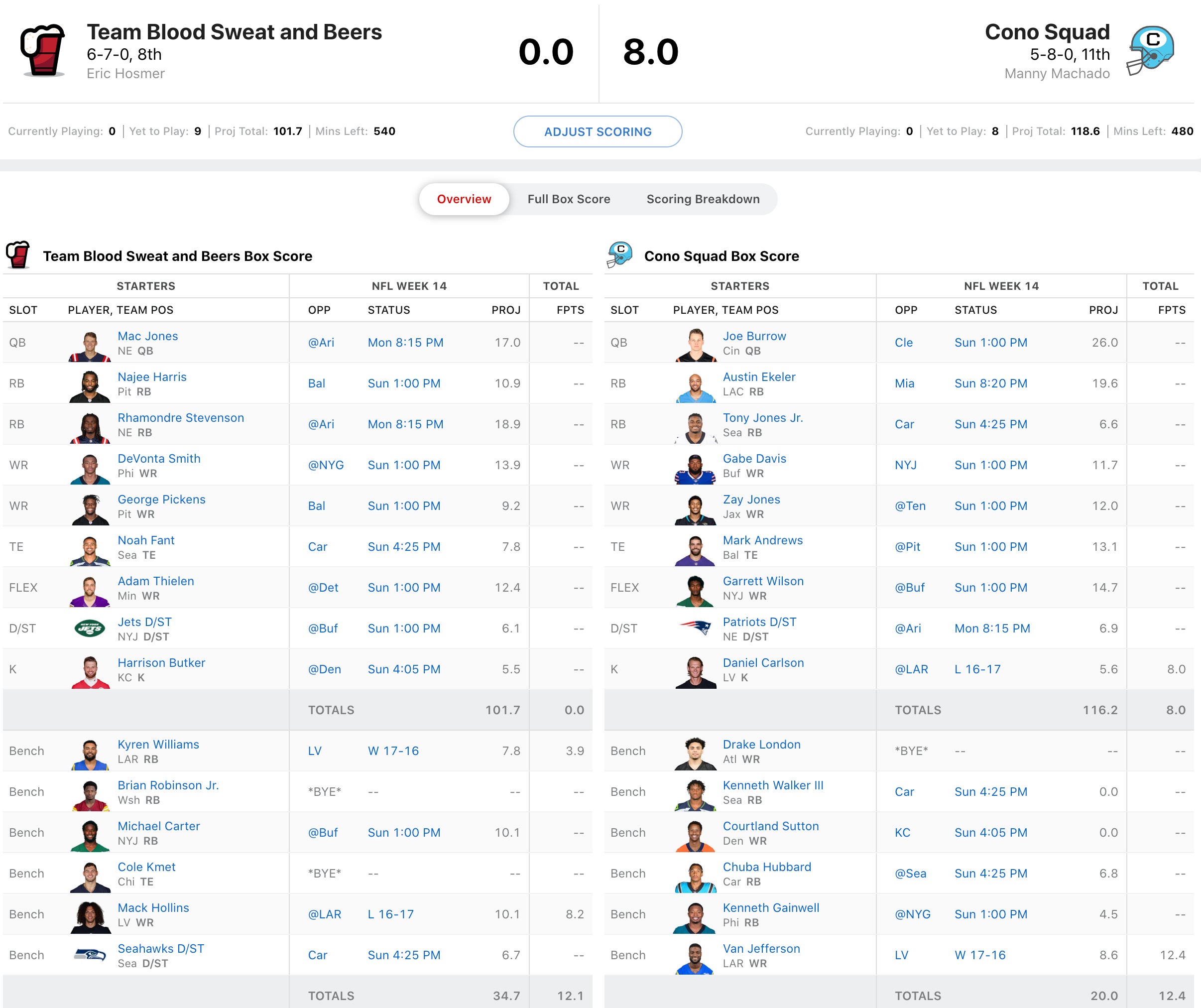 Tony Jones Jr. is an uninspiring start, but Manny's got some hitters with Joe Burrow, Austin Ekeler, Garrett Wilson, and Mark Andrews. Meanwhile, Hoz has got Mac Jones starting at QB1 which isn't very good. Najee Harris has a tough matchup vs. Baltimore but he'll need a massive game from Rhamondre Stevenson on MNF to have a shot. Adam Thielen is a sneaky scoring threat today in what should be a shootout vs. Detroit.