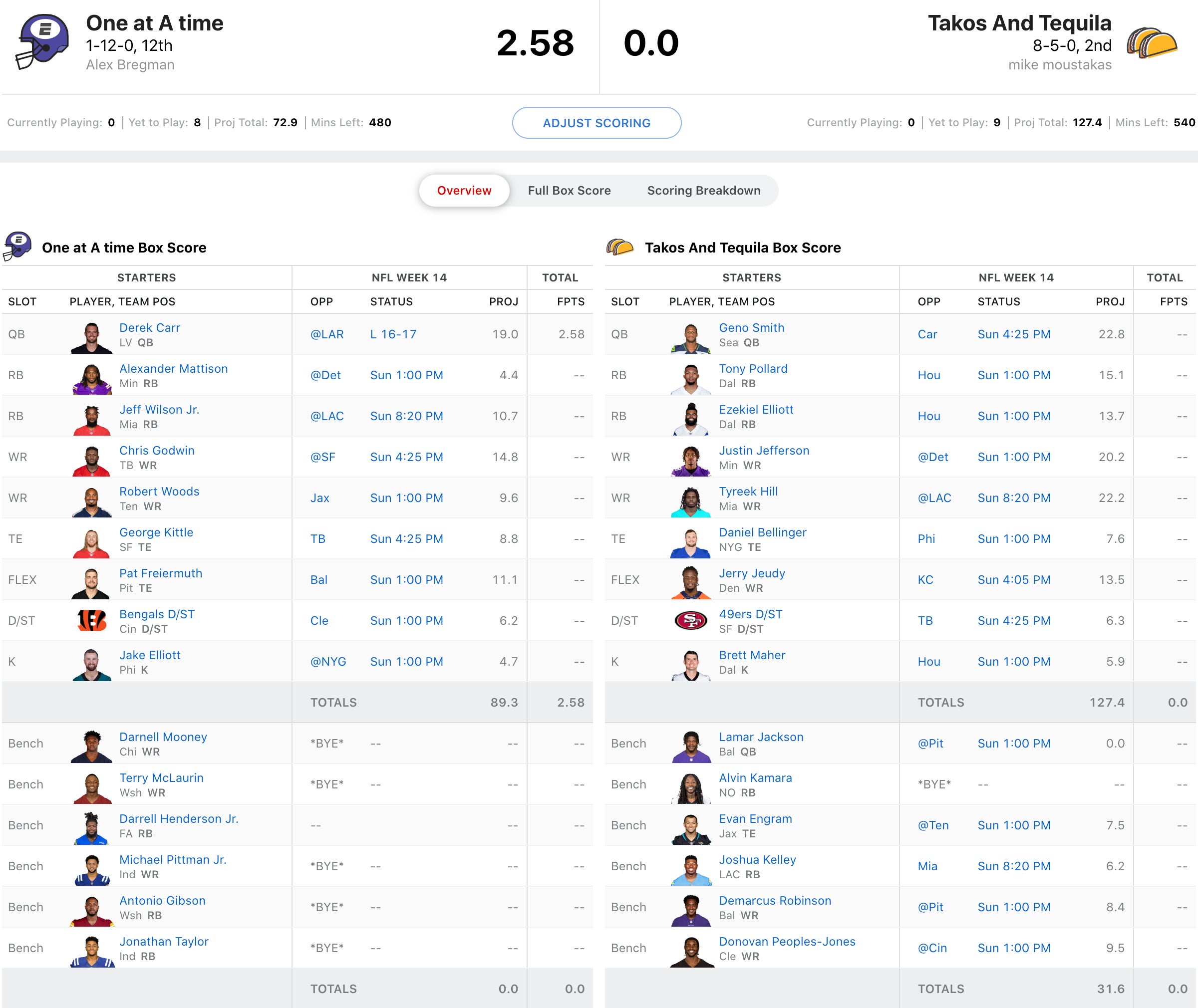 Myers saw three of his players go on Thursday Night football, including two of his most explosive ones in Josh Jacobs and Davante Adams, and all of them underperformed their projections. He'll need a big game from Patrick Mahomes, playing a tough Denver defense and Ja'Marr Chase going against another divisional rival to win here. And I like primetime Herbert and Dalvin Cook in what I think will be a shootout today. Also TJ Hockenson gets a revenge game and Jamaal Williams has 14 TDs this year. I think the Cinderella story moves into the postseason.