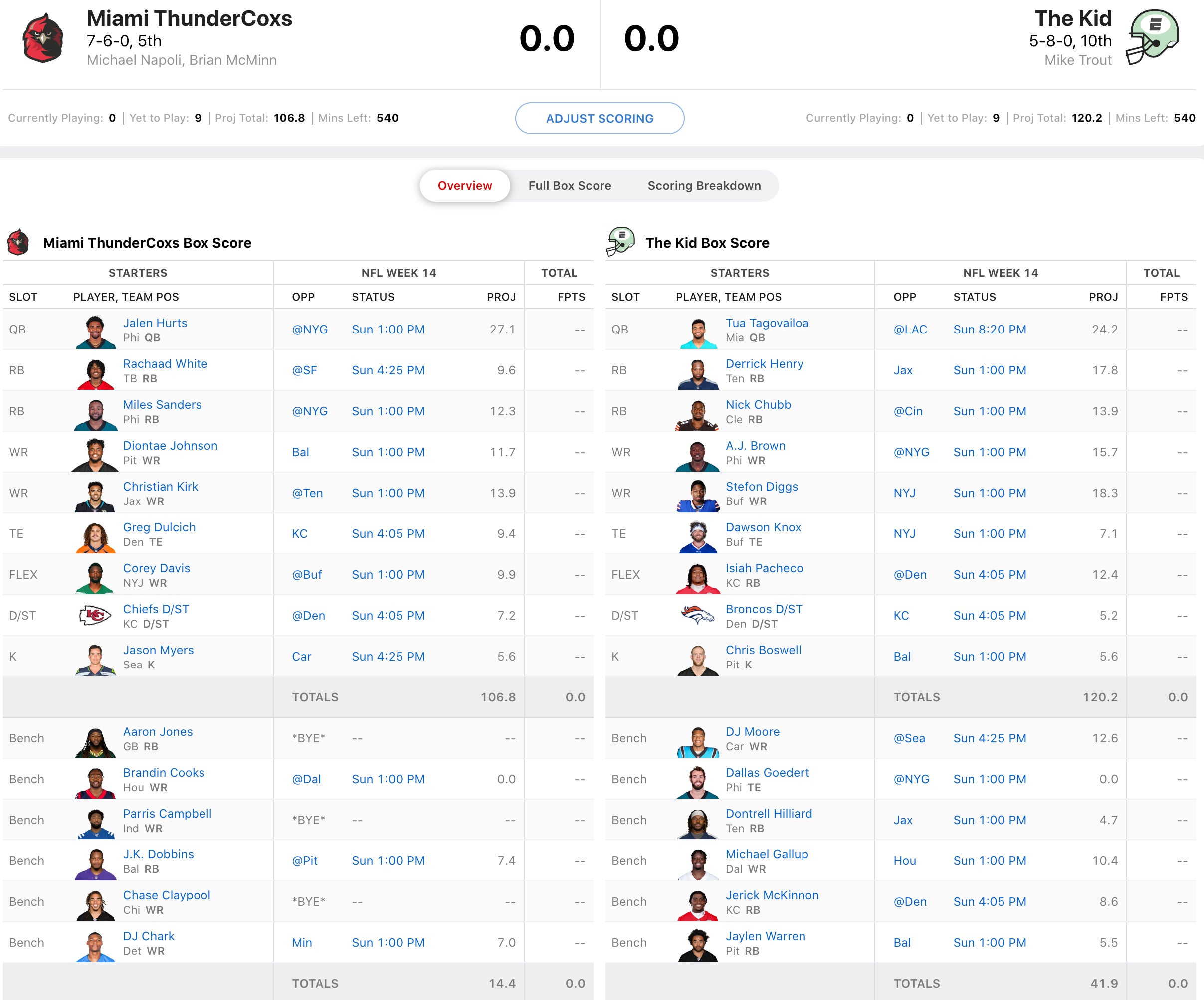 Nap gets a very poorly timed bye week from Aaron Jones and he'll need HUGE games from fringe guys like Greg Dulcich and Corey Davis. Diontae Johnson has been very disappointing this year but maybe he can turn in a big game against an old foe. Meanwhile, Trout has Tua in a big time matchup vs. the Chargers on SNF. He's also got two of the top RBs in the league with Derrick Henry and Nick Chubb. If Hurts throws a TD to AJ Brown it'll offset, and having Stefon Diggs is a major advantage. I like Trout to win this going away.