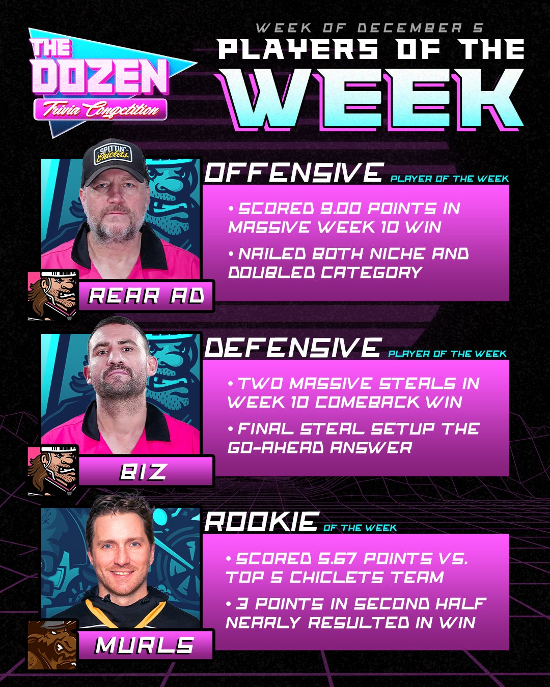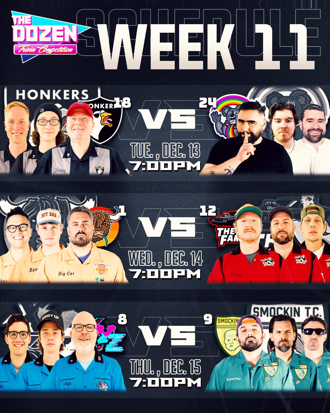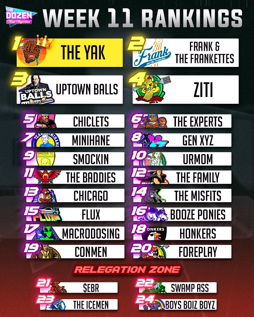 Week 11 of The Dozen is here. The Yak returns for the first time since the NY live show, the Big Screamin’ Honkers play to keep the original Dozen Champions out of the relegation zone, and Smockin battles XYZ in a battle between underrated squads. Our correspondent Scoops L'Aguirre has the breakdown…