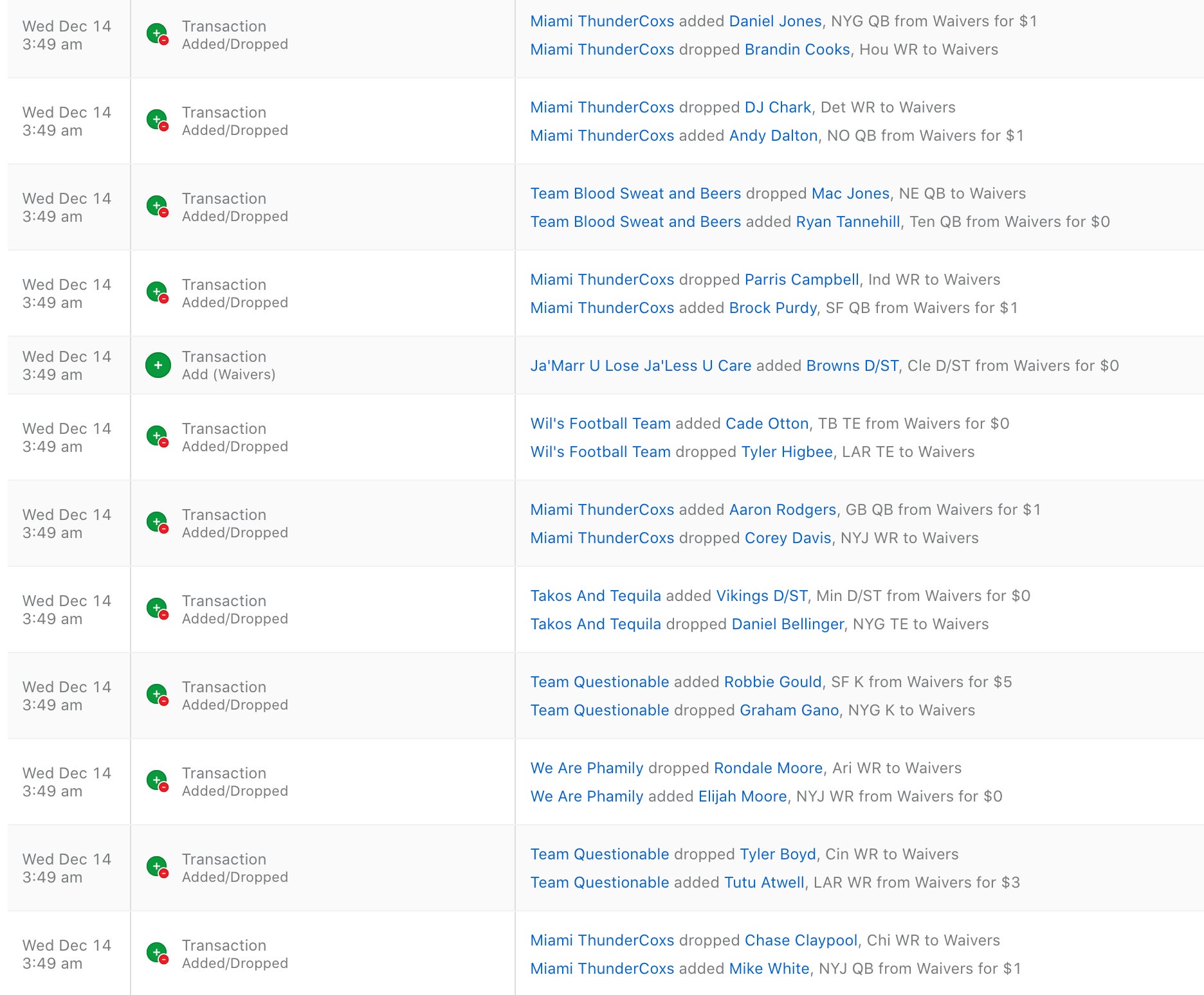 Mike White, Aaron Rodgers, Brock Purdy, Andy Dalton, and Daniel Jones. He ended up dropping Chase Claypool, Corey Davis, Parris Campbell, DJ Chark, and Brandin Cooks. An all-time move from Napoli. You can't help but respect the shit out of it. It's win or go home and he attacked his opponent's weakness. Looking forward to seeing how things shake out this week and how Bieber and Hedges recover.