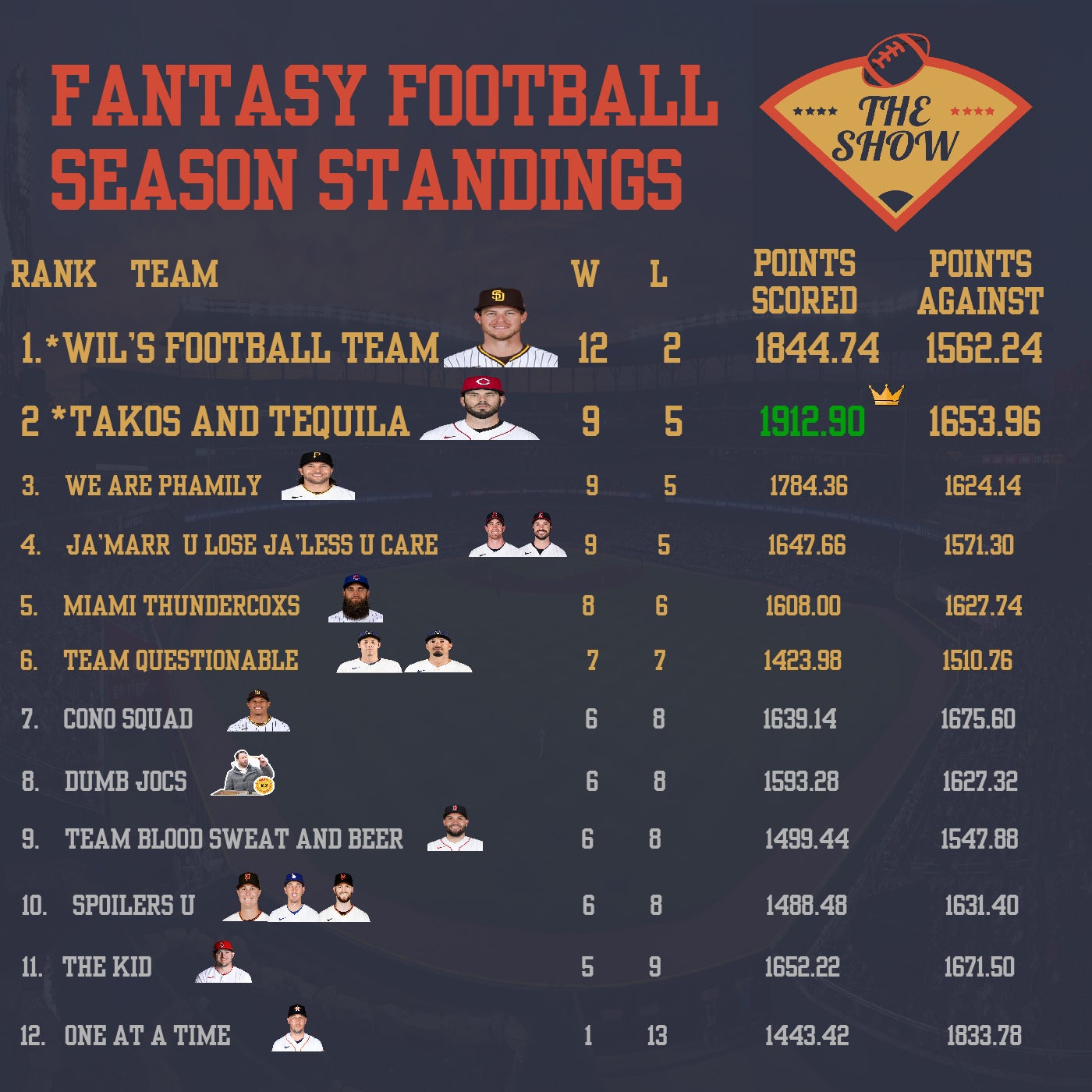 The final weekend of the fantasy football regular season has ended and we're onto the playoffs. It's been a wild regular season so far with Mike Trout having potentially the best roster, but finishing 11th, Christian Yelich & Jace Peterson scoring the least amount of points and getting into the dance, and defending champ Alex Bregman ending the regular season 1-13.