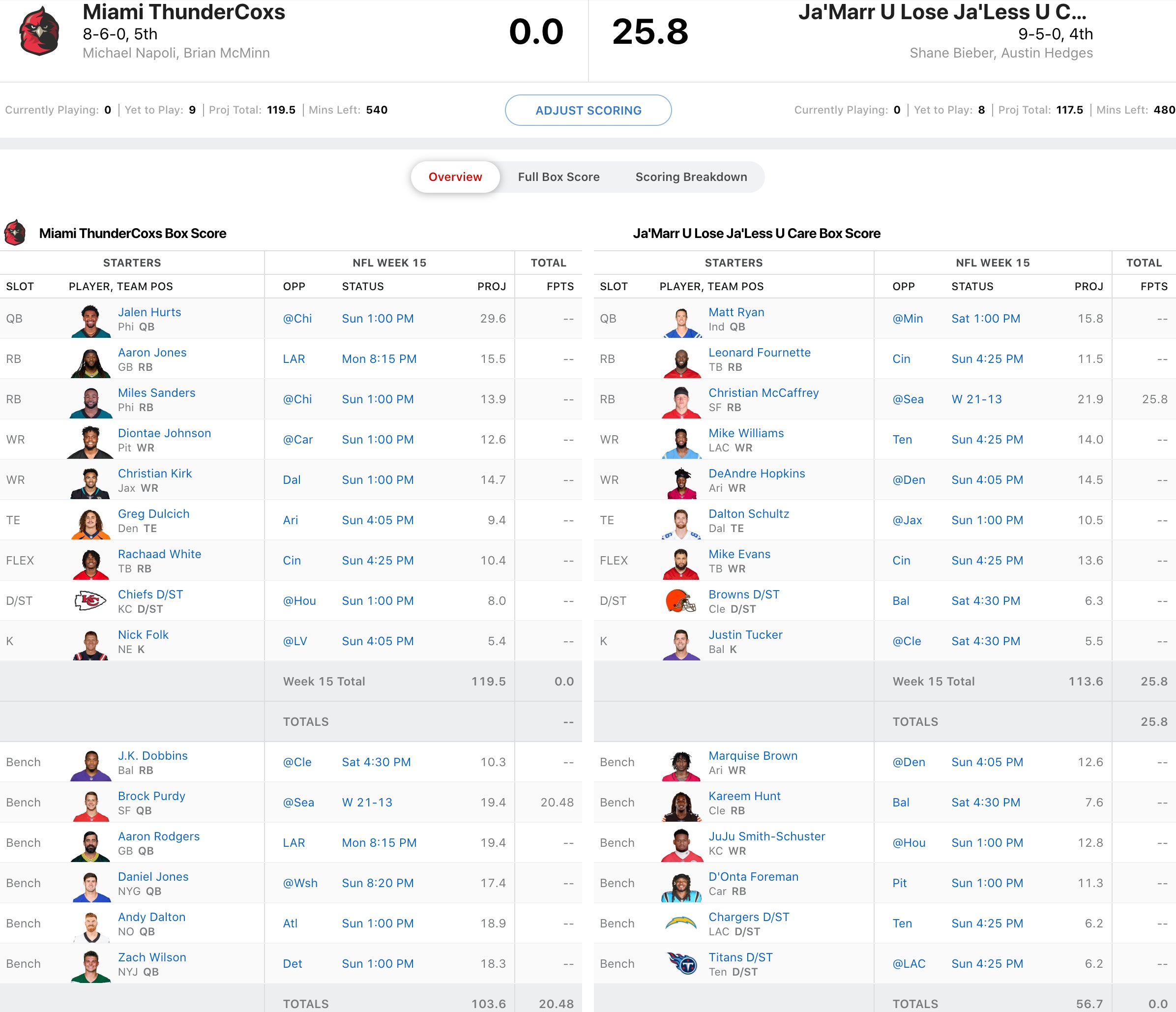 Biebs & Hedges originally picked up Ryan Tannehill, but dropped him for Matt Ryan who is facing the NFL's worst pass defense as far as yards per game. But I think we could see the wheels start to fall of this squad as the loss of Kyler not only impacted their QB position, but their WRs too as Deandre Hopkins and Hollywood Brown (on bench this week) take massive steps back in value with Colt McCoy under center. Mike Evans has been slumping too so they'll need massive games from Matty Ice, Barstool Lenny, Mike Williams, and Dalton Schultz to have a shot this week. Napoli has a great matchup with Jalen Hurst and Miles Sanders taking on the Bears who are happy to trade touchdowns. Greg Dulcich also gets the Cardinals, who give up the most fantasy points to TEs in the NFL. Aaron Jones should be the cherry on the Sunday on MNF.