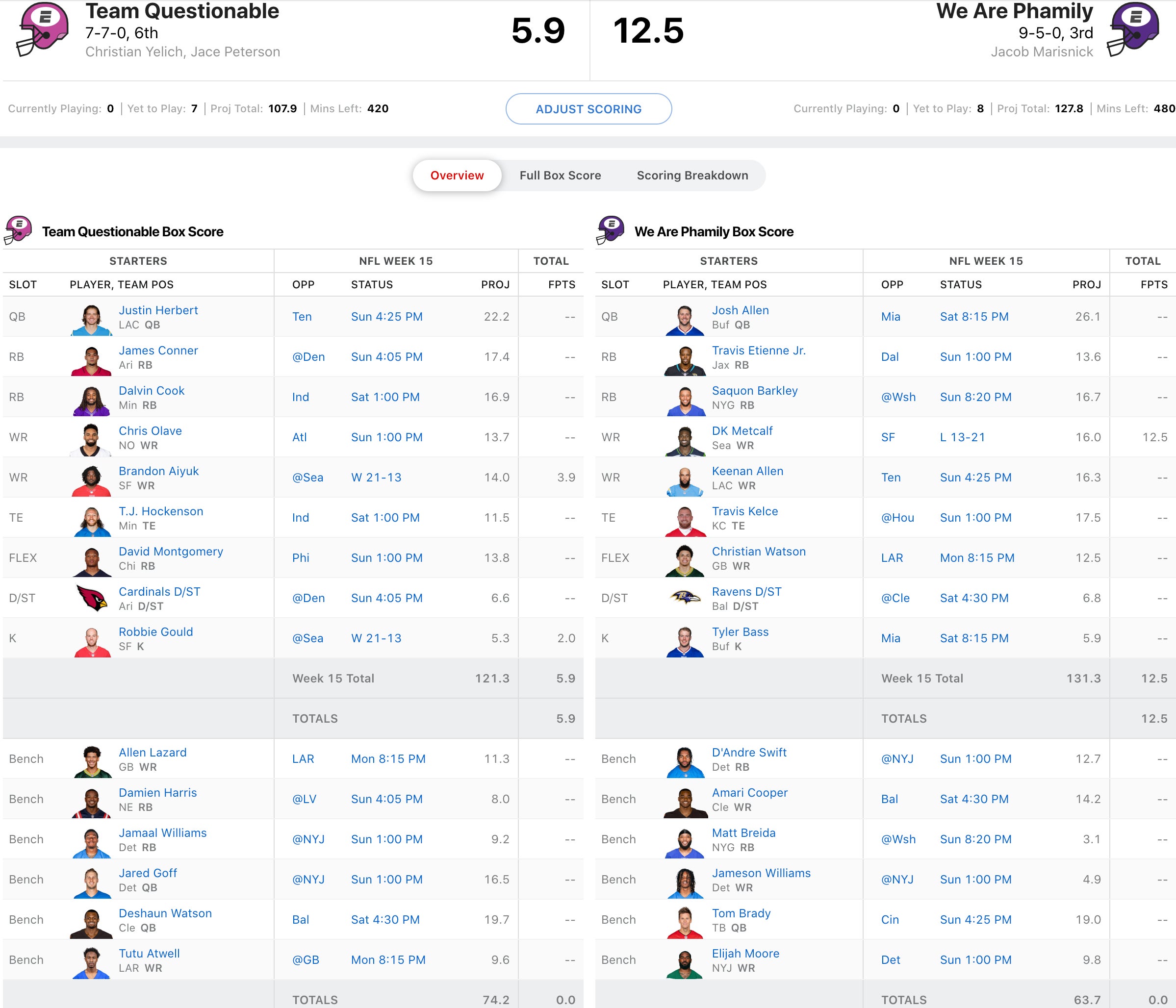 Team Questionable has an uphill battle after Brandon Aiyuk put up a clunker on TNF. They do have some decent matchups with Dalvin Cook getting a leaky Indy D and Justin Herbert getting a vulnerable Titans pass D. But I’d be hard pressed to bet against Marisnick’s diesel squad that has a ton of stallions with Josh Allen, Travis Etienne, Saquon Barkley, and Travis Kelce among others. It’s hard to imagine them not making a deep run this postseason.