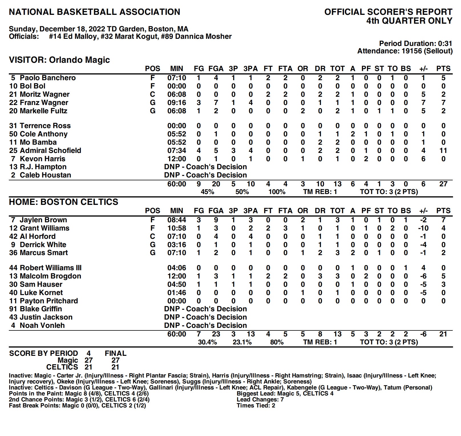 Now the turnovers. A cool 16 turnovers that led to 13 Magic points. That seems significant in a game you lost by 2 points. Add in 25.5% shooting from deep and there you have it. Those are the 3 boxes you can check for every loss the Celts have this season.