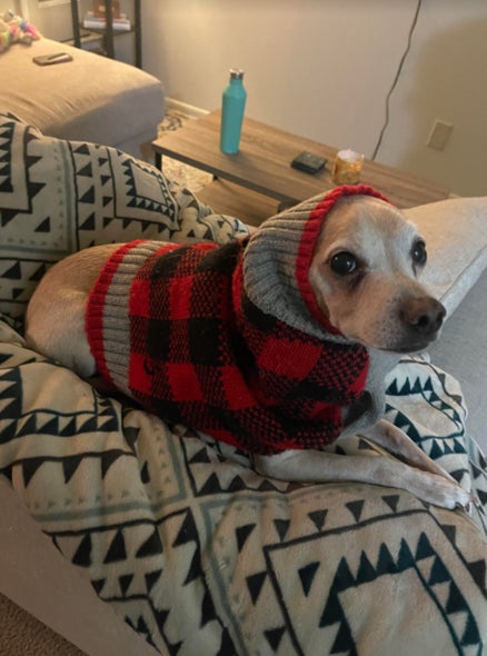 9:00am: Woke back up. A small panic ensues as I realize my dog does not have a sweater for the party. I walked him to my local pet store, Hound About Town, to buy an emergency dog sweater.