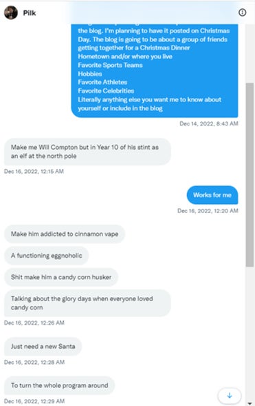 Me: Thank you, dog. Ok, I have an idea. I'm going to go see if Pilk is still outside, and maybe he'll do his Will Compton North Pole bit for us.