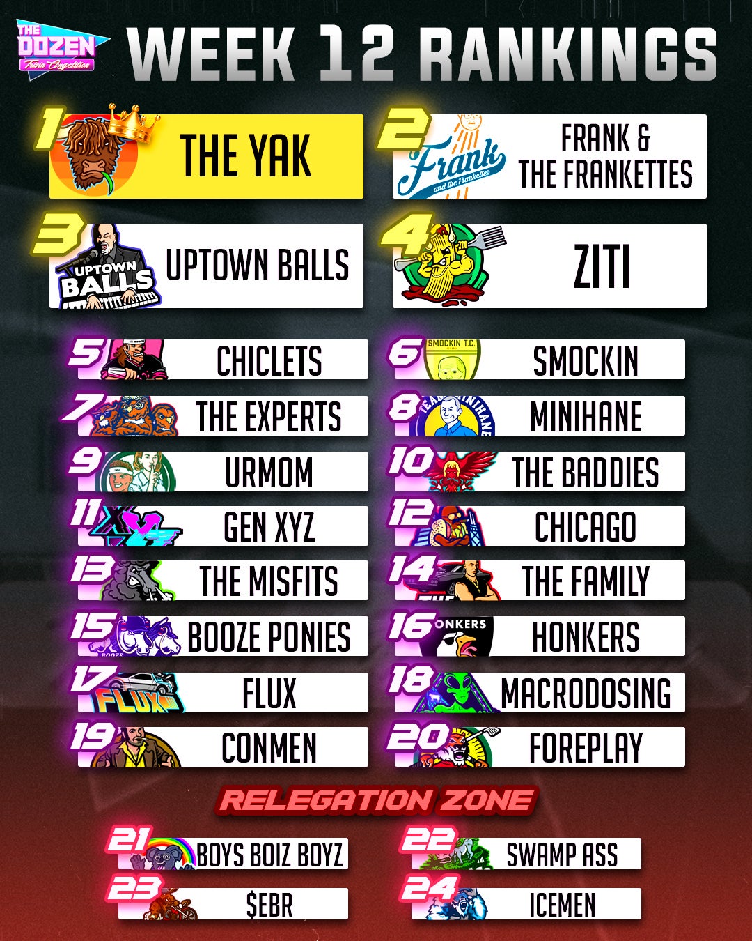 The Dozen Week 12 is here. For Christmas, you get four games in one week! To kick off, you get the reigning Champs taking on the reigning MVP as Uptown Balls and Team Minihane face-off. Paddy the Baddy returns to play against The Dozen’s holiday team, urMom. The Experts get to end 2022 with a tournament rematch against The Misfits. To end our week, we have Will Compton vs. Dave Portnoy for the first time. Our correspondent Scoops L'Aguirre has the breakdown…