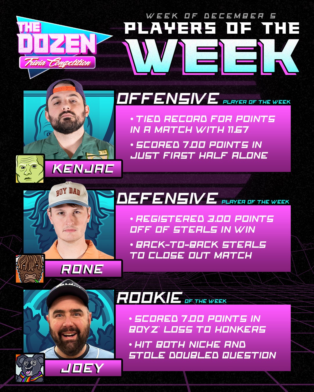 · Joey gets Rookie of the Week after a big 7-point performance, knocking down his Niche, Television, Geography, and stealing the Big Screamin’ Honkers Doubled Movie question.