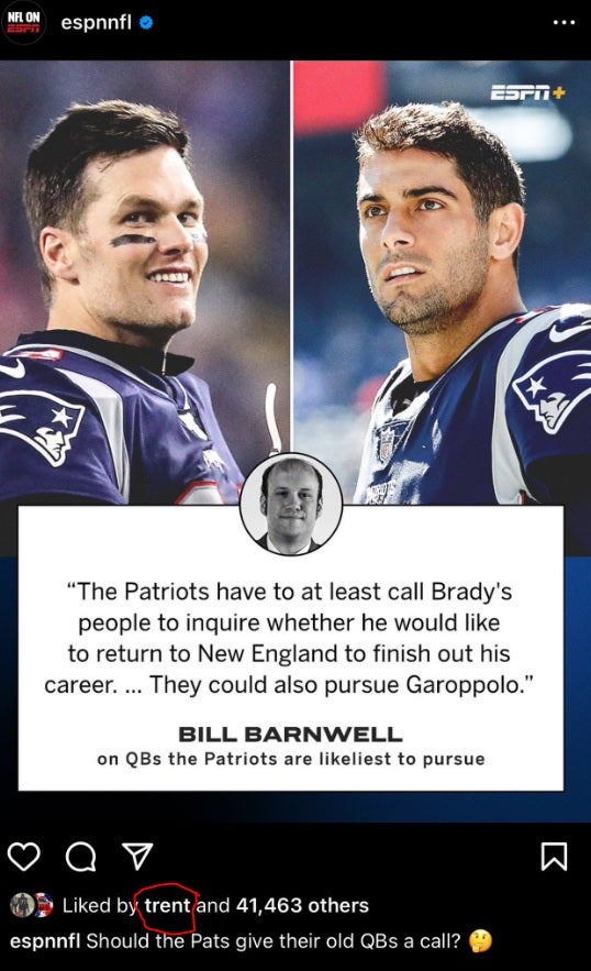 But then again, he's hardly the most prolific social media user. He's had his IG account since 2012 and has all of seven posts on there. And of all the posts he could've accidentally put his stamp of approval on, one suggesting bringing back the QB he won a ring with in 2018 is a little too on the nose to chalk up to just a whoopsies!