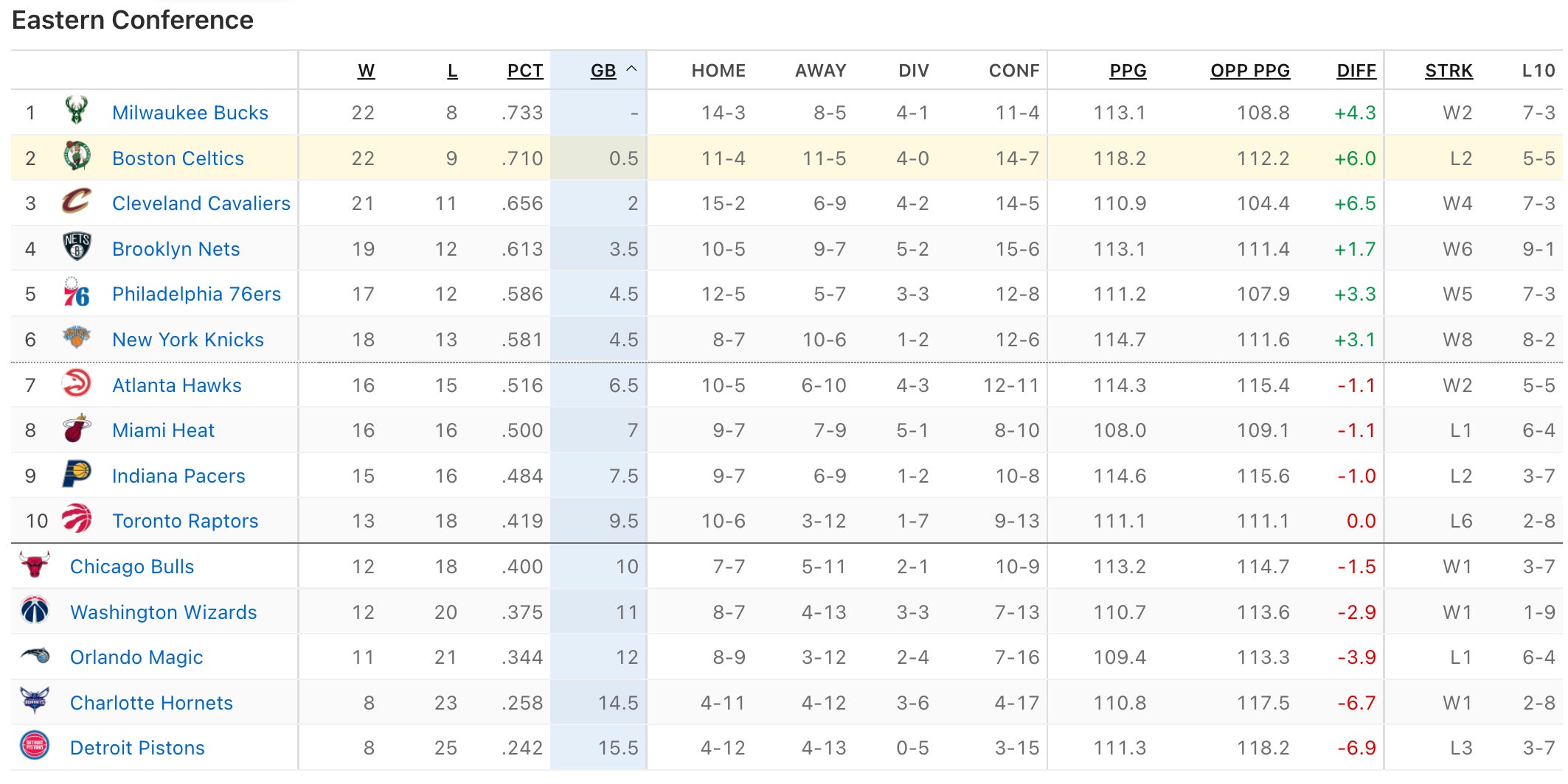 Every team in the top 7 minus the Celts is on at least a 2 game winning streak. With MIL/CLE playing tonight and BKN playing GS, we could have a situation where there are at least 4 teams that have at a minimum 20 wins on the season. If the Cavs win tonight, that would make 3 separate teams with at least 22 wins. If you were curious, no team out West has more than 19 (DEN). Think of how crazy it is that a team like the Knicks who are playing incredible basketball right now can win 8 in a row and not even move up in the standings because everyone ahead of them is also on a pretty substantial winning streak. It just goes to show you how well everyone in the conference is playing right now and barring injury, why should that stop?