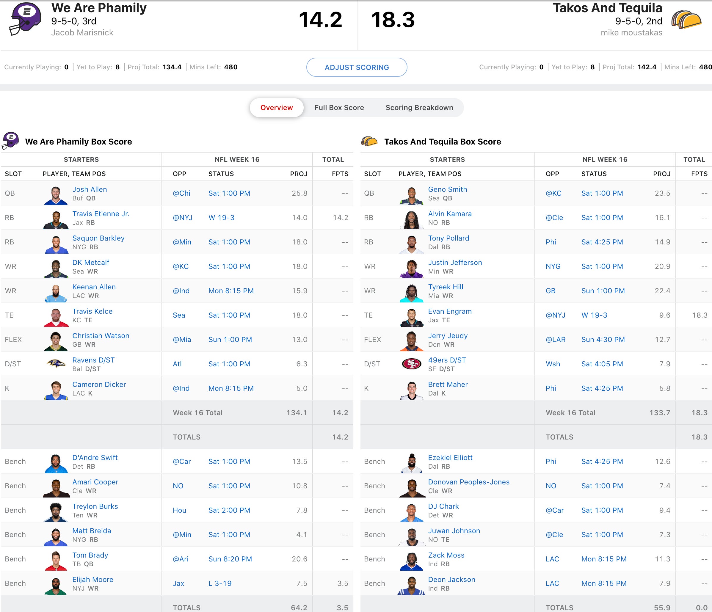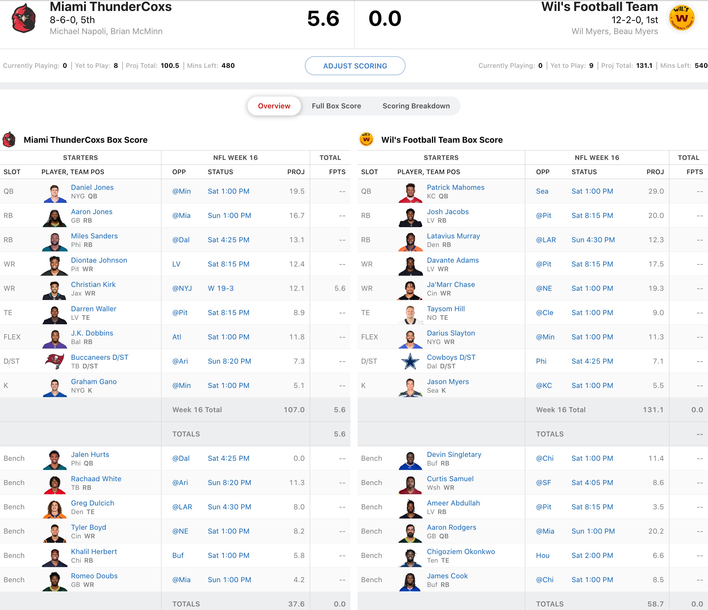 Myers is a 30 point favorite in this game because his roster is insanely stacked. Mahomes, Josh Jacobs, Davante Adams, Ja'Marr Chase headline the league's leader in wins. But Napoli has been sneaky lately and I like the Giants today. So Daniel Jones, JK Dobbins, Aaron Jones, and Miles Sanders need to have enormous games for a guy clearly missing his QB1 (Jalen Hurts). I think Napoli makes it a close matchup, but it'll be hard to match Myer's firepower.