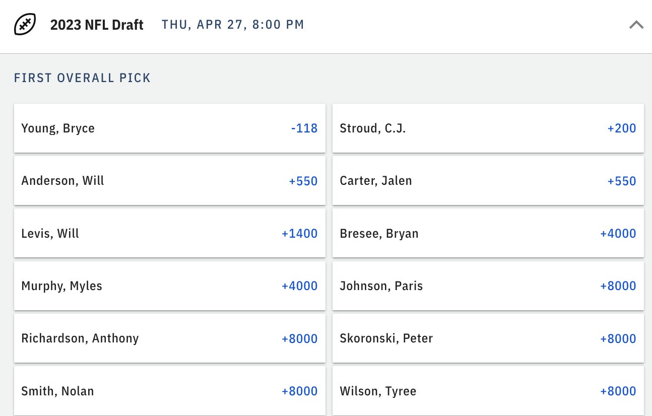 Here are the latest odds for the No. 1 overall pick, courtesy of Barstool Sportsbook: