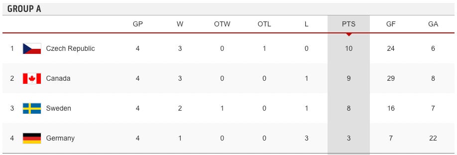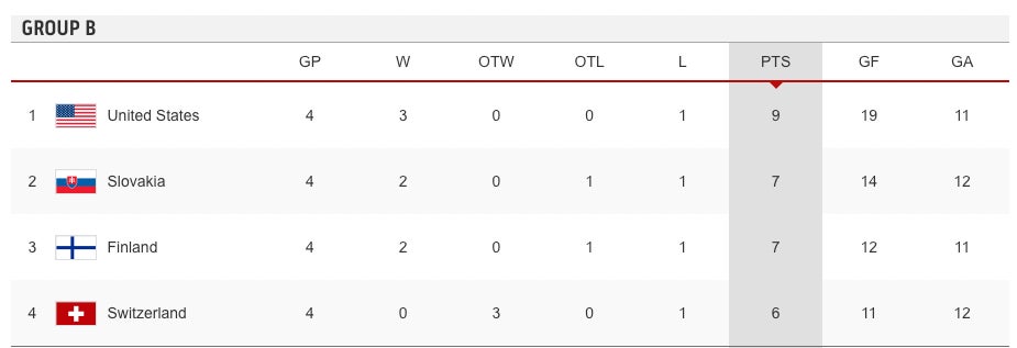 You look at Group B and the 4 teams moving on are all separated by just 3 points. The Swiss are heading into the quarterfinals as the 4-seed and they beat 3 out of the 4 teams they played in this tournament. Only issue is that all of those wins came in overtime. But they beat Finland, they beat Slovakia, they beat Latvia. And for all of that, they get to play the top seed in Group A as their reward. Tough break.