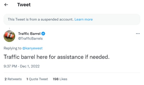 For those unfamiliar with who Traffic Barrel is, I think I can sum it up quickly. He's owns the Twitter account @TrafficBarrels, and he responds to tweets offering his assistance to the brightest minds on the internet.