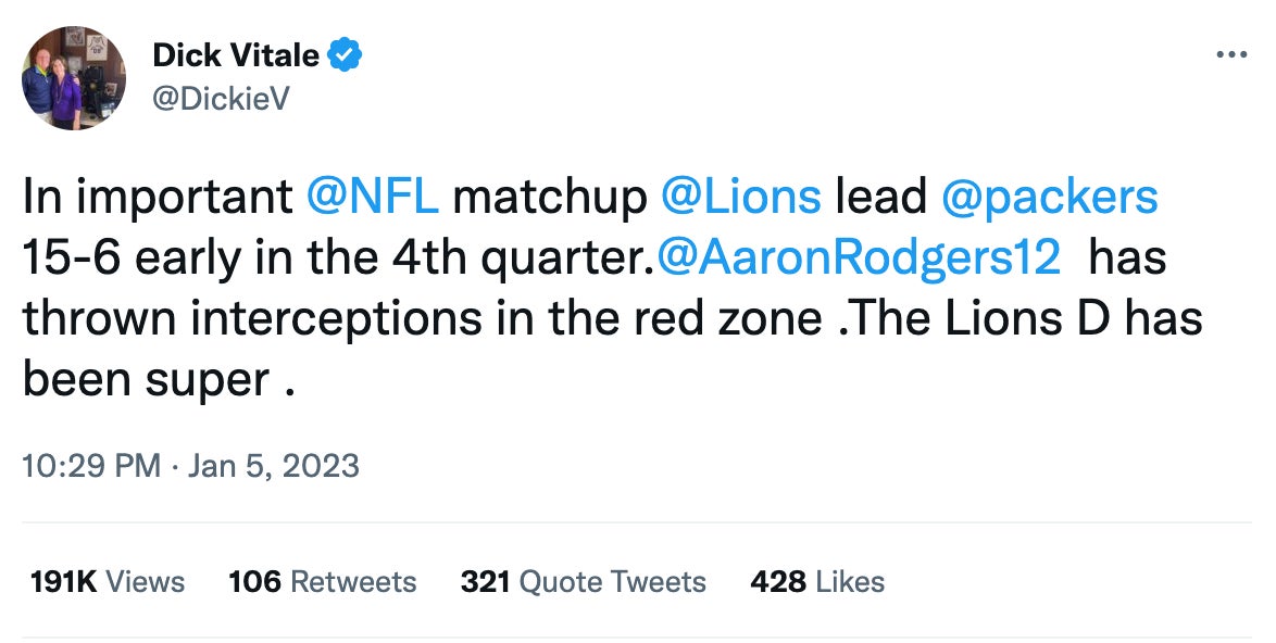 That said, I love how blissfully unaware Dickie is. Man just wants to fire off updates and some takes on sports. It reminds me of my grandfather who would fall asleep at night watching a Mets game only to finish it the next morning/afternoon and get mad at the result. Could have avoided it entirely by just seeing the score and refused. Now Dickie V has to deal with Aaron Rodgers and the Lions on Sunday night.