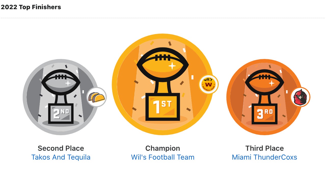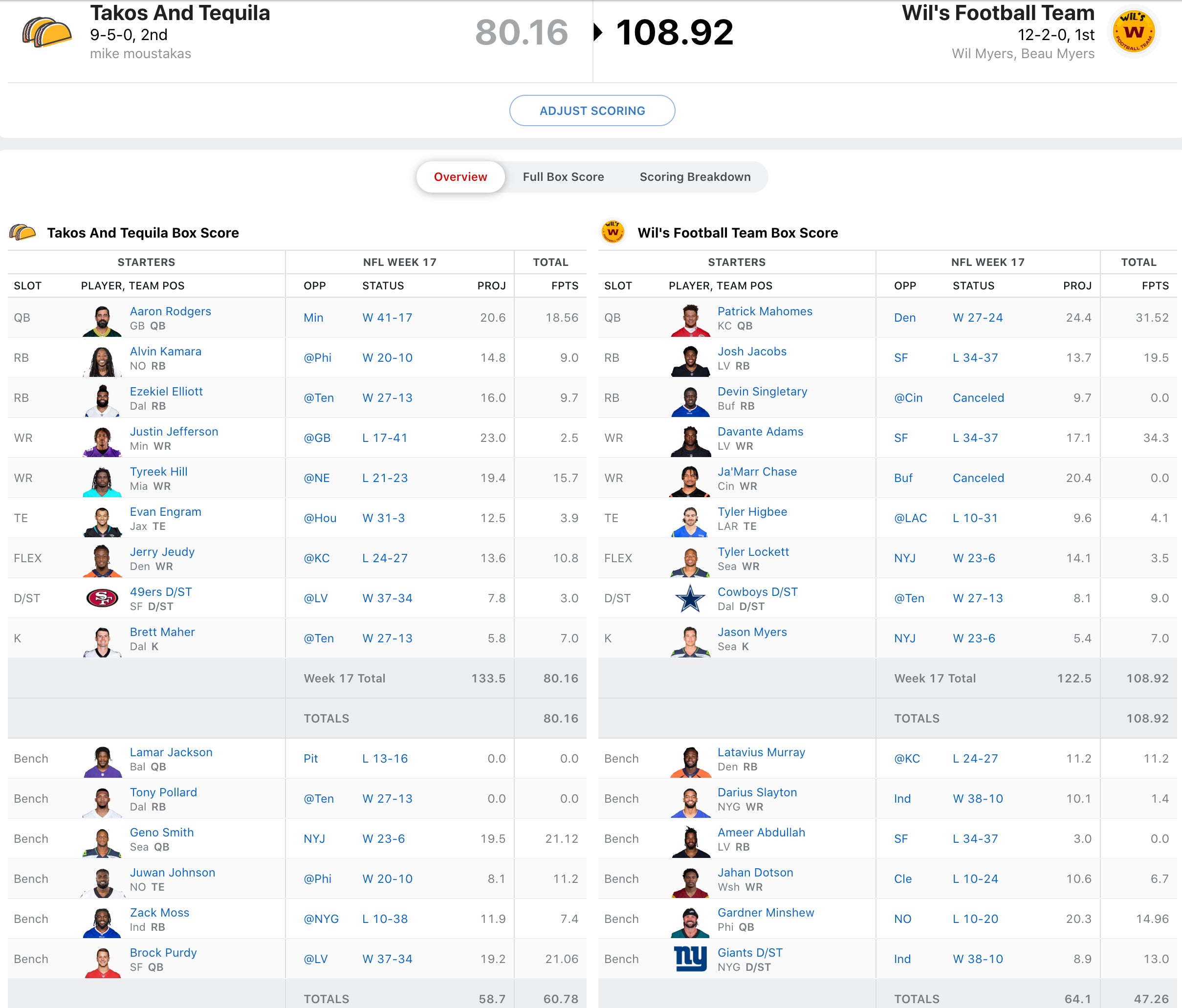 Once Chase got back healthy, Will’s team really hit their stride. Here is his final roster.
