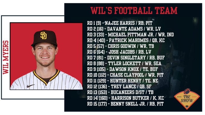Wil Myers has won The Show fantasy league. With heavy hitters like Mike Trout, Manny Machado, and Dave Portnoy amongst other huge Major League personalities, Wil has stood a cut above. Looking back, he did a great job in the draft and got some steady rocks that would help lead his 12-2 squad on a weekly basis. Patrick Mahomes in a 6-point passing TD league is a cheat code. He was the top overall player nearly 500 points on the season. Davante Adams finished as WR3 in full point PPR behind only Justin Jefferson and Tyreek Hill. Meanwhile Josh Jacobs led the NFL in rushing and finished as fantasy’s RB3 in full point PPR. Having three Top 3 players at their position at each of the three main positions is outstanding drafting.