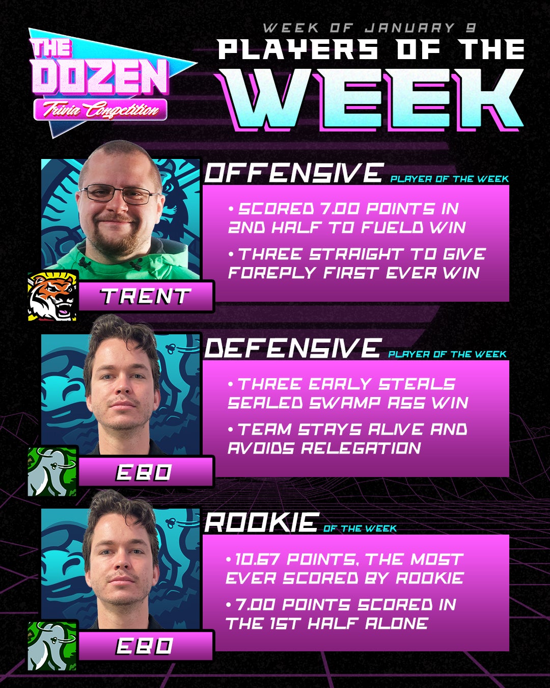 - Ebo wins both Defensive Player of the Week and Rookie of the Week after a dominant 10.67-point performance that included stealing his opponent’s first three questions. The Conmen were emotionally from the jump because of Ebo.