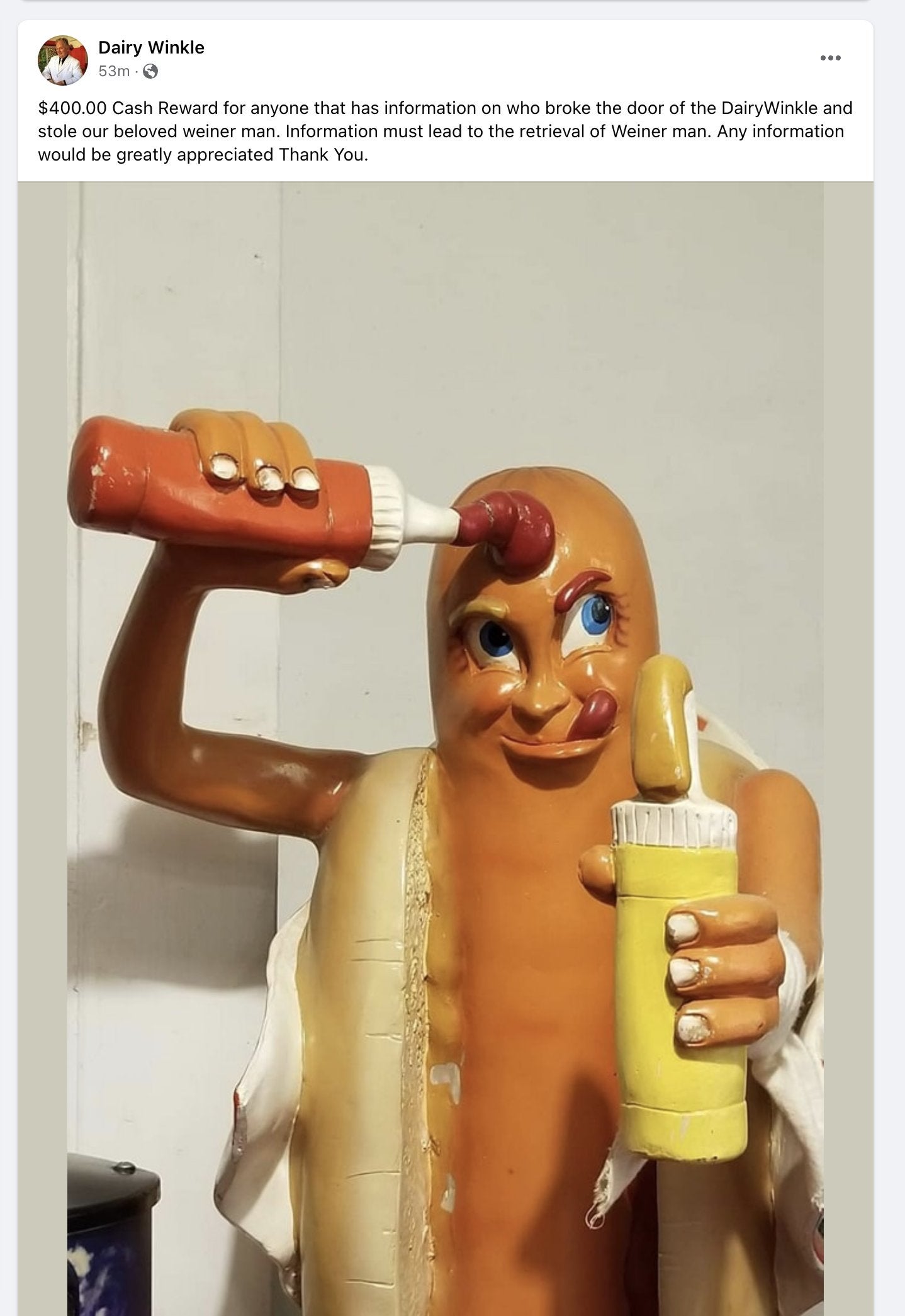 So this story comes out about a West Virginia restaurant sadly getting damages via a fire. To make matters worse a prized Hot Dog statue was stolen sometime after the fire. Now, obviously I'm happy the owner got back their statue, as well as hoping they can get back to their business and make a ton of money. I'm also upset with whoever stole it especially after a fire because that's a pretty shitty thing to do.