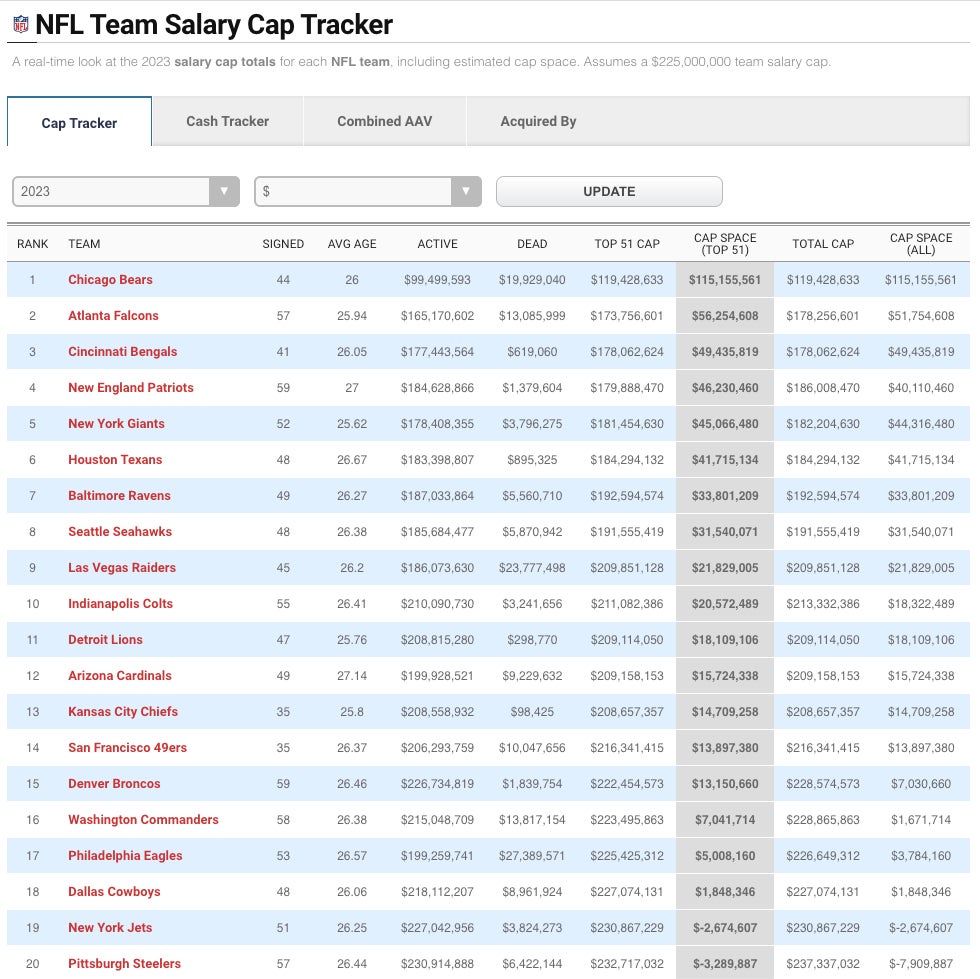 So in those top 20 teams with cap room, we've got the Raiders, 49ers, Commanders, and Jets.
