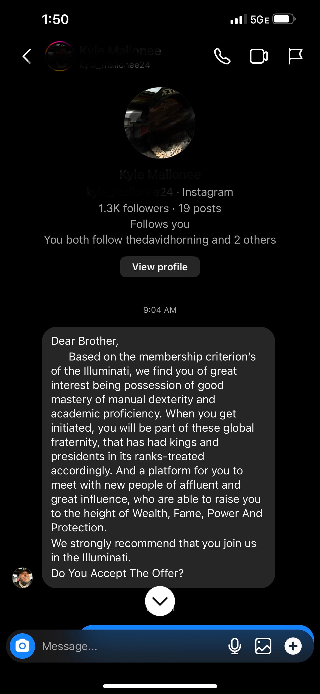 Now one could be skeptical about this person who sent me the DM. I'm not sure I ever really thought about what an Illuminati recruiter might look like but if I had I know it wouldn't be a 20-something kid that looks like Lil Terio all gown up.