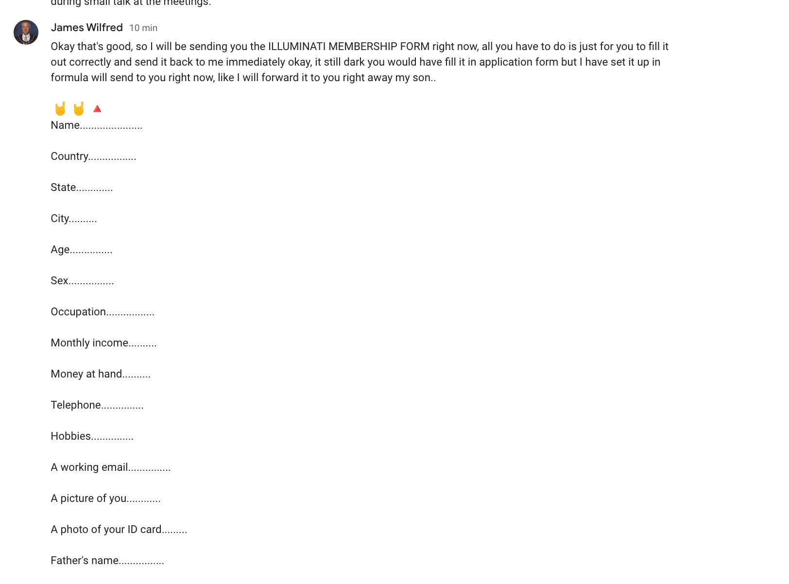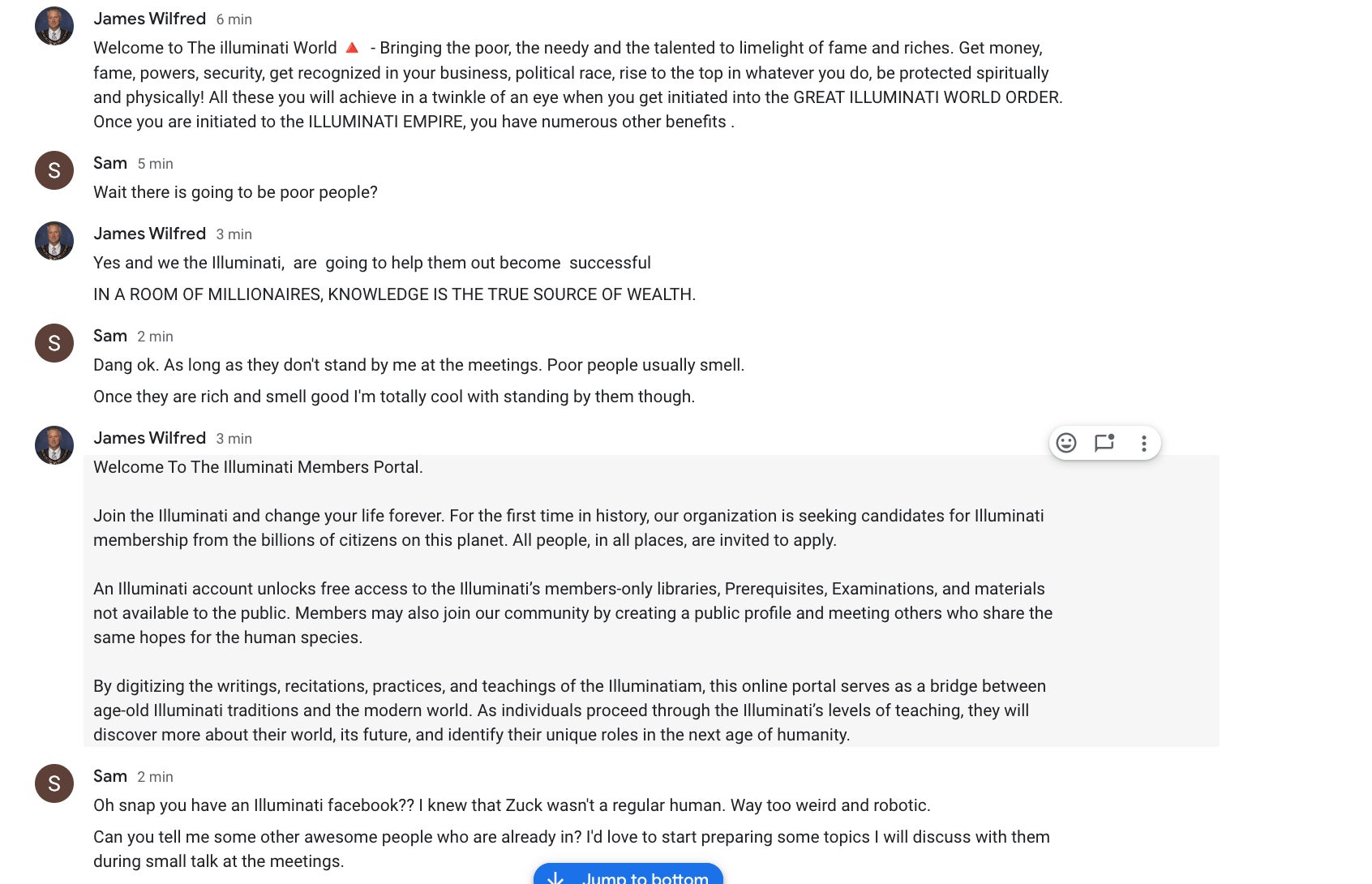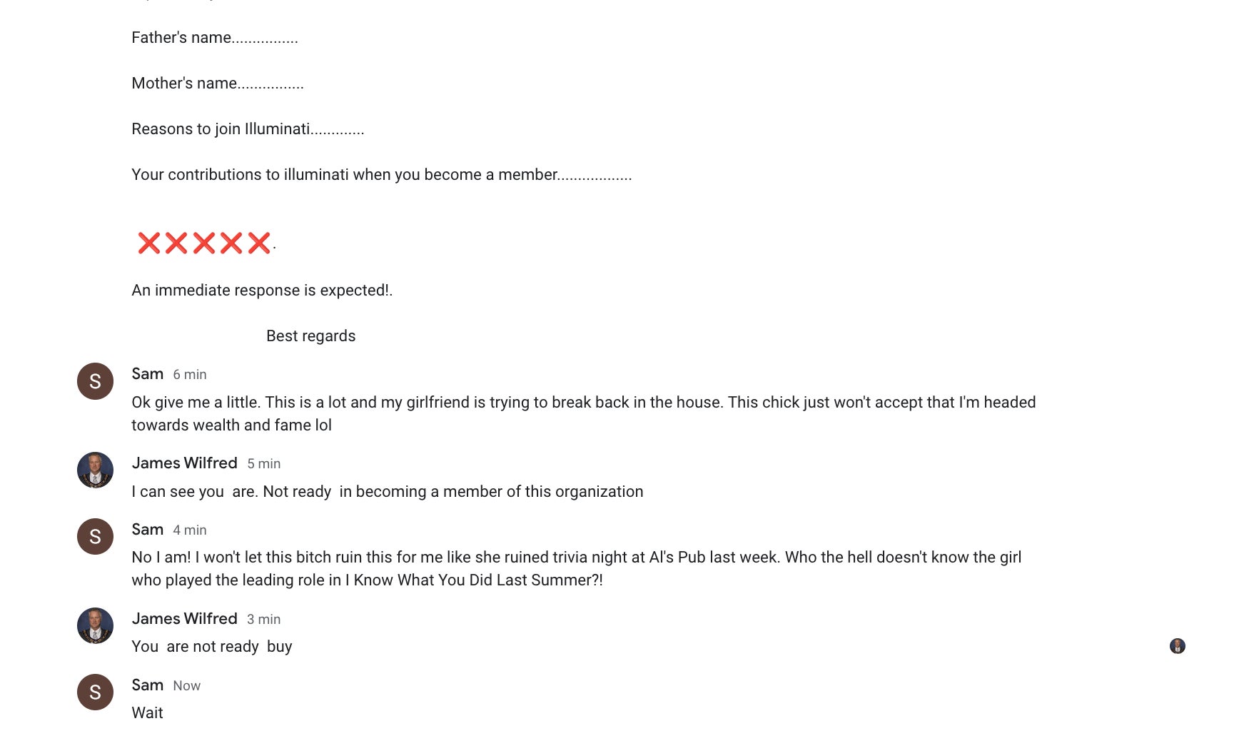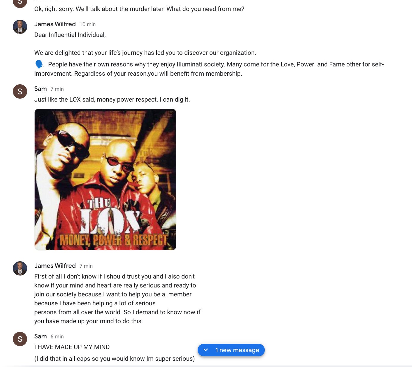 And then, just when I was about to give up, I received a google chat notification. It was James Wilfred, grand master of the Illuminati.