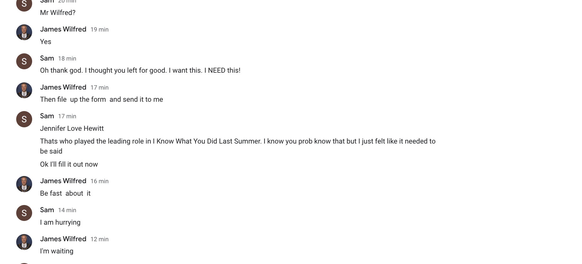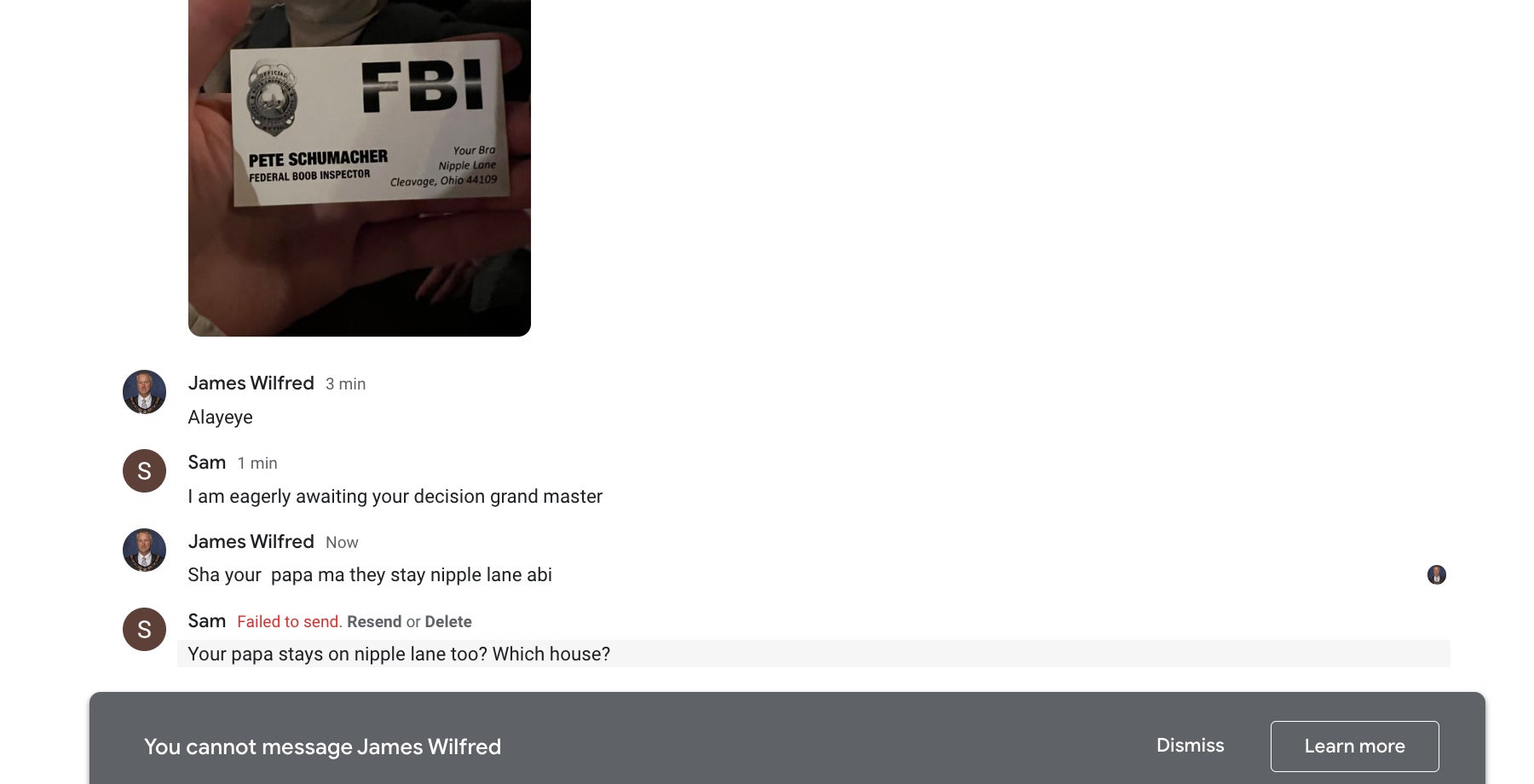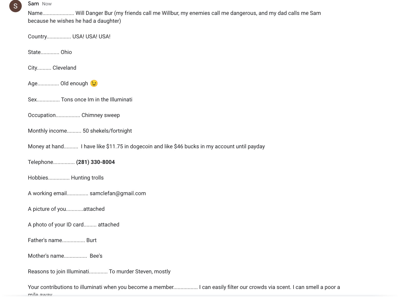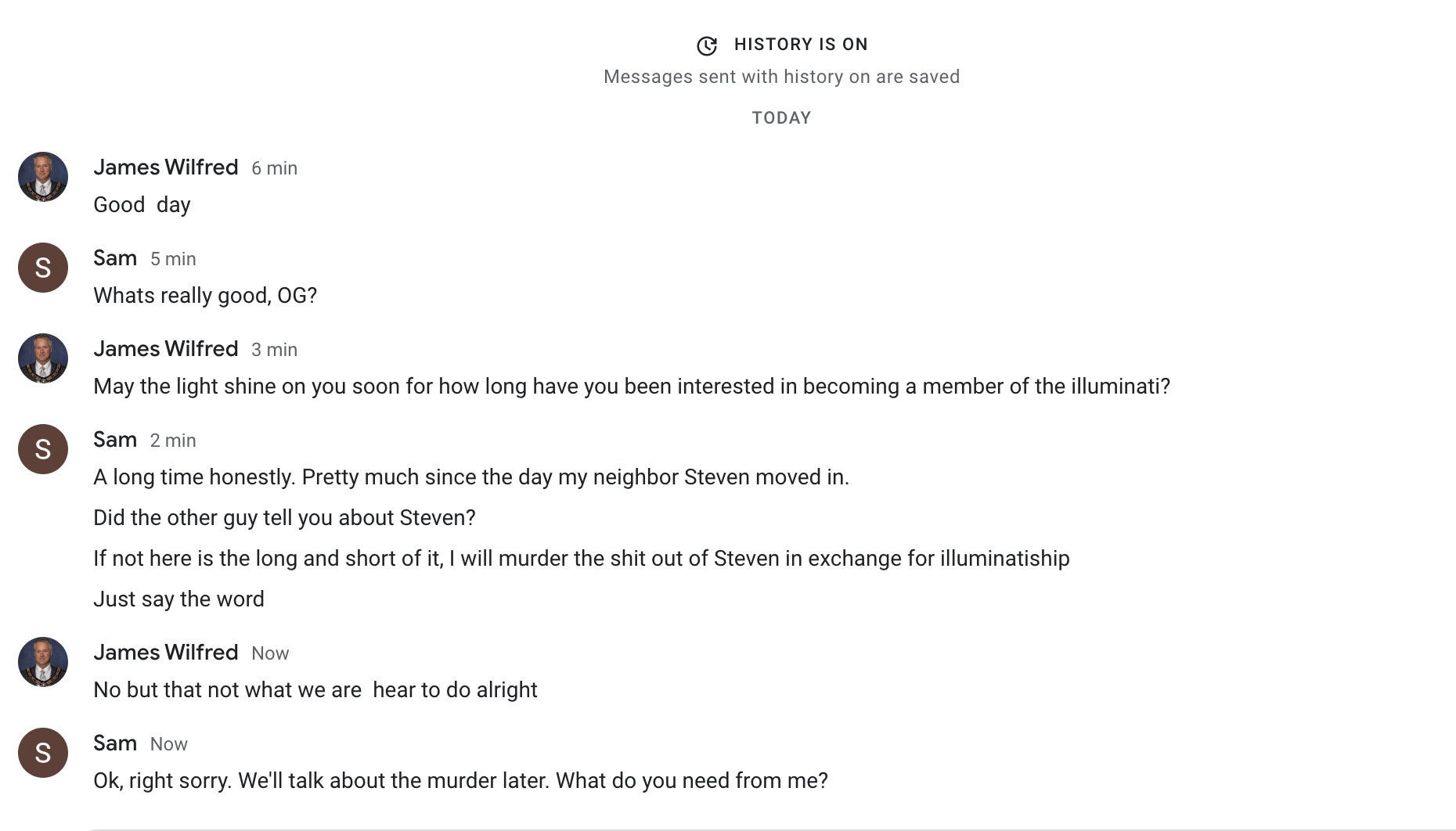 And then, just when I was about to give up, I received a google chat notification. It was James Wilfred, grand master of the Illuminati.