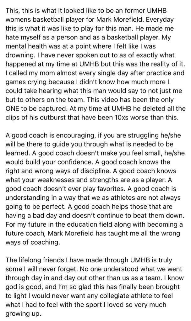 Bad, bad stuff here from Morefield. If this one video shows any kind of light as to what kind of coach Morefield was this doesn't look like an isolated incident and more of the norm as his player described. It seems like Morefield lost it more than he contained it, and to make matter worse it was while coaching a Women's team.
