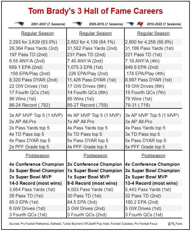 … it's more important than ever that we take full measure of the standard Brady set. A few seasons ago, we were splitting his career into two distinct Canton-worthy halves. Now that it's been over 21 years, we can divide by three, and each seven-year stretch is first ballot material: