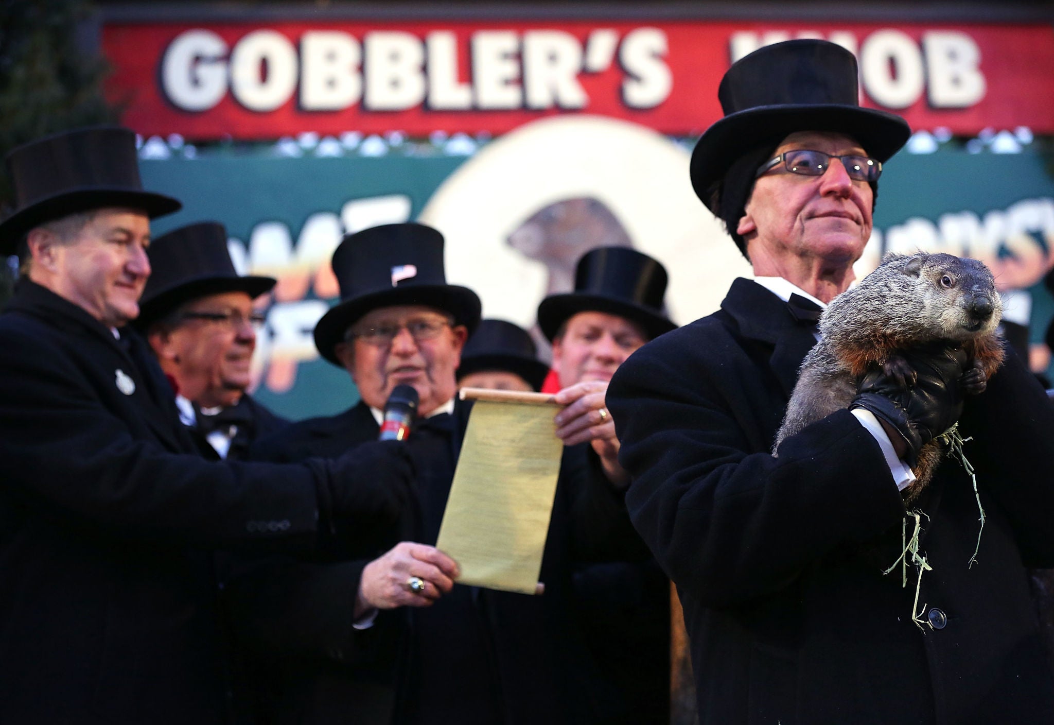 I'm paraphrasing here, but long story short, on February 2, 1887 a magical groundhog named Punxsutawney Phil emerged from a hole in the ground at a place called Gobbler's Knob (bonk). For some reason, they came to the conclusion that if Punxsutawney Phil sees his shadow, there will be 6 more weeks of winter. If he does not see his shadow, then spring will arrive early. The world was so enthralled by this weather predicting groundhog, that they turned it into an annual thing. Now, and for the rest of eternity, on February 2nd, men dressed as Mr. Peanut gather around the hole at Gobbler's Knob and hold a ceremony for the groundhog.