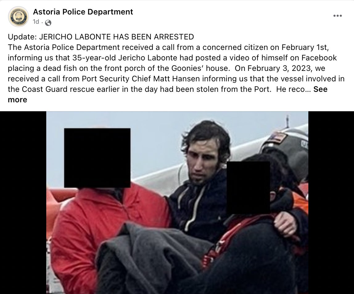 The Astoria Police Department was alerted to this activity and confirmed it was 35-year-old Jericho Labonte of Victoria, B.C.