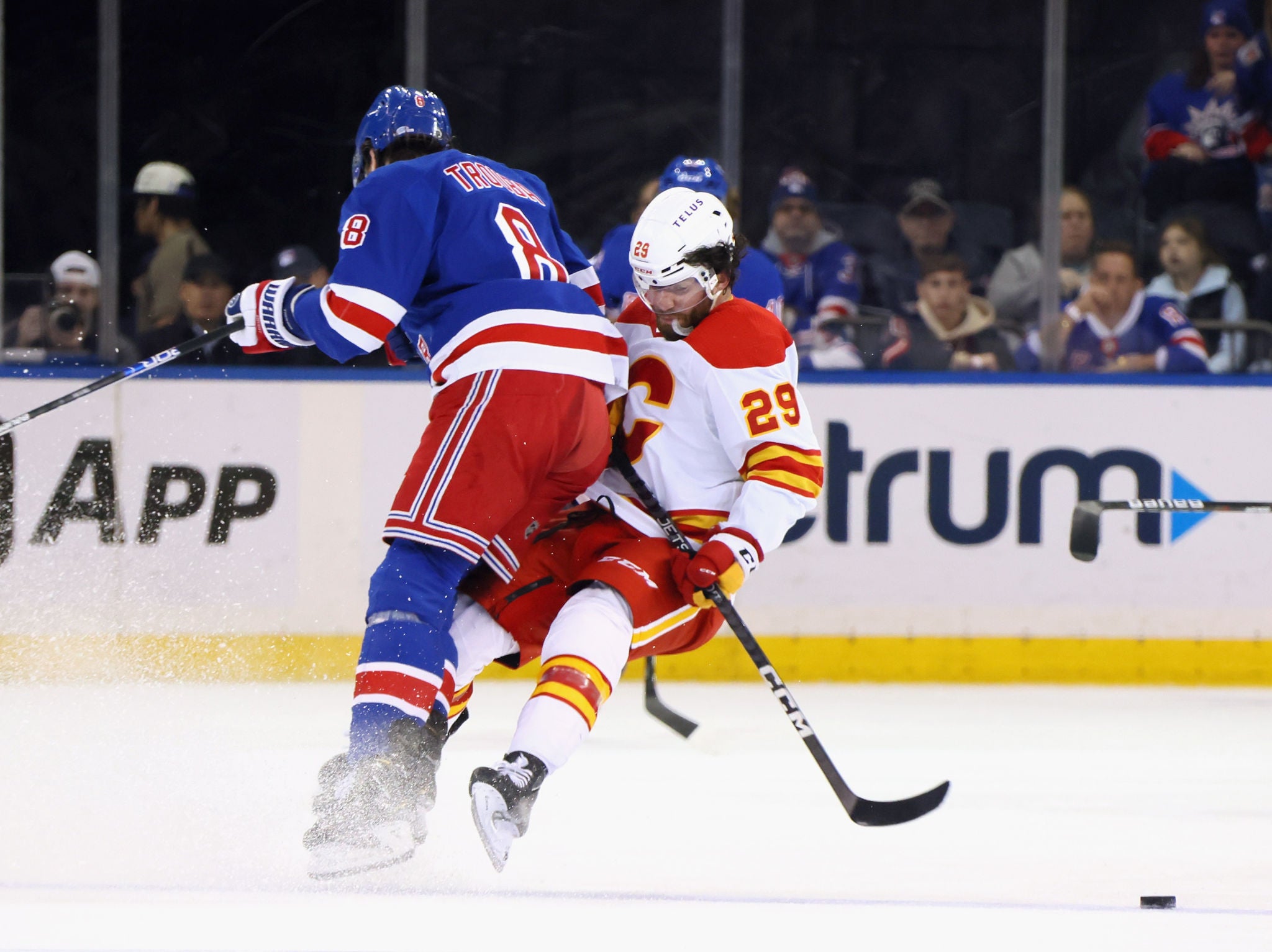 Unfortunately for Dillon Dube, this was his chance to get a little payback on Trouba but instead he ends up with his back on the ice again.