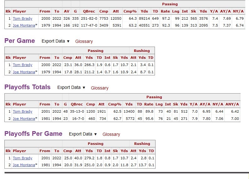 And as Brady's career gained on Montana's that advantage still went to Joe Cool. But it simply got to the point where it was no longer close enough for a tiebreaker to apply. Brady simply just won too much and for too long for a possession arrow. Even if you allow for the different eras, you cannot account for him essentially doubling Montana up in wins, touchdowns, passing yards, postseason wins, and so on. The one-on-one comparison from Pro Football Reference: