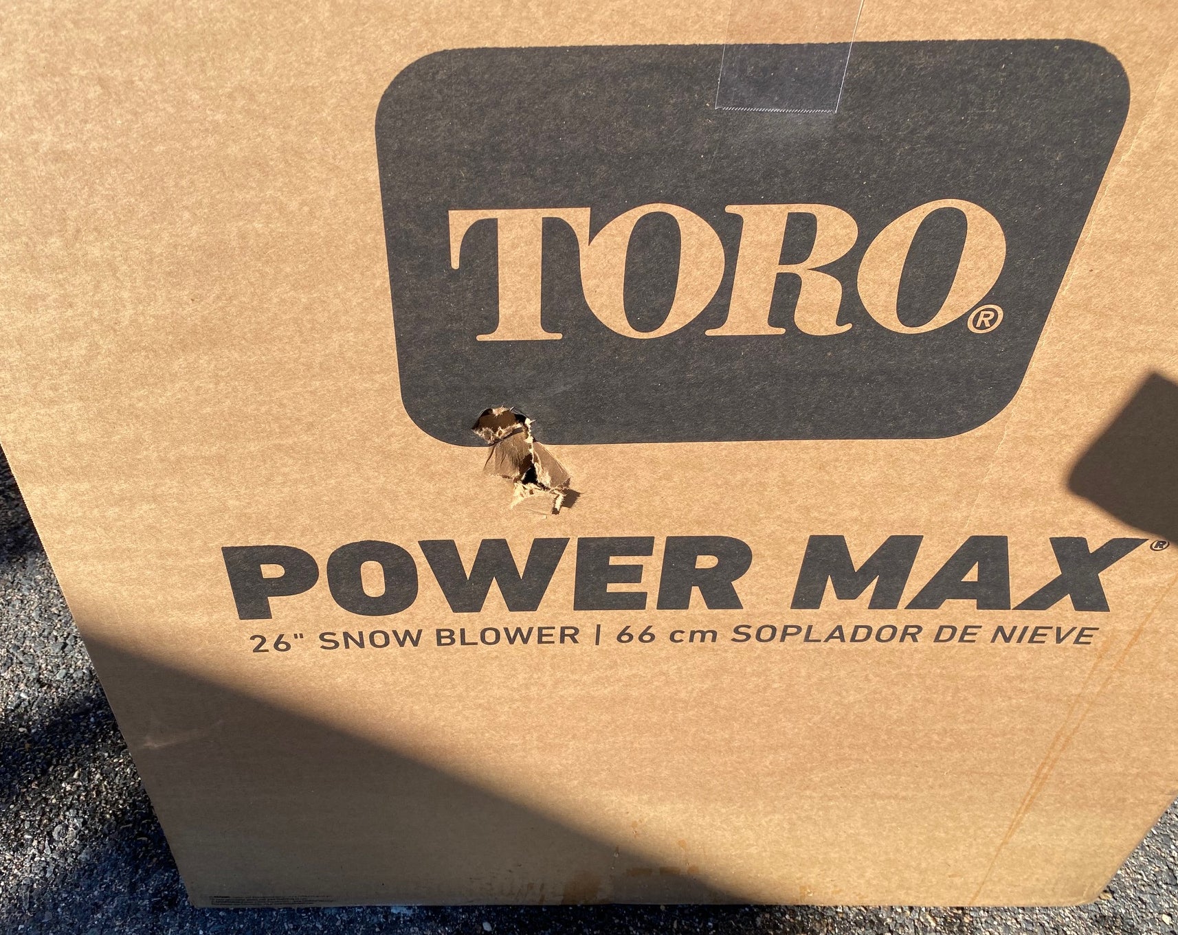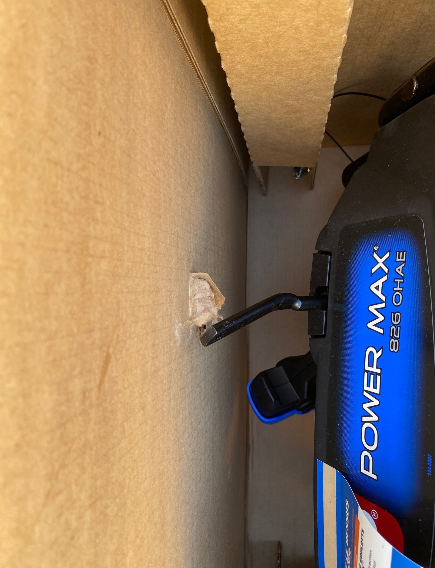 When he opened the door to his delivery truck, I saw a box marked Toro. The problem was it was vertical, standing on end, not flat on the floor the way it was supposed to be. And to make matters worse, the long end of the box was open. I immediately approached the delivery guy and said it shouldn't be standing upright, and if the box is open, it could be damaged. He said it was fine. I offered to get some tape before he attempted to move it, but he was quick to say it was okay and not to worry. He wheeled it onto the electric tailgate, lowered it, and then wheeled it over to my sheds and set it down the correct way. I looked in the cardboard box, no wooden skid, and I said to the kid, "If there's anything wrong with it, I don't want it." He said it was fine and if there was anything wrong to call Home Depot, they'd take it back. Then he handed me a small plastic cover he said fell off one of the handles, and he pointed to a hole in the side of the box… I wasn't feeling good about this, but knowing there was a supply shortage, I figured I may as well take it and see if it was okay…